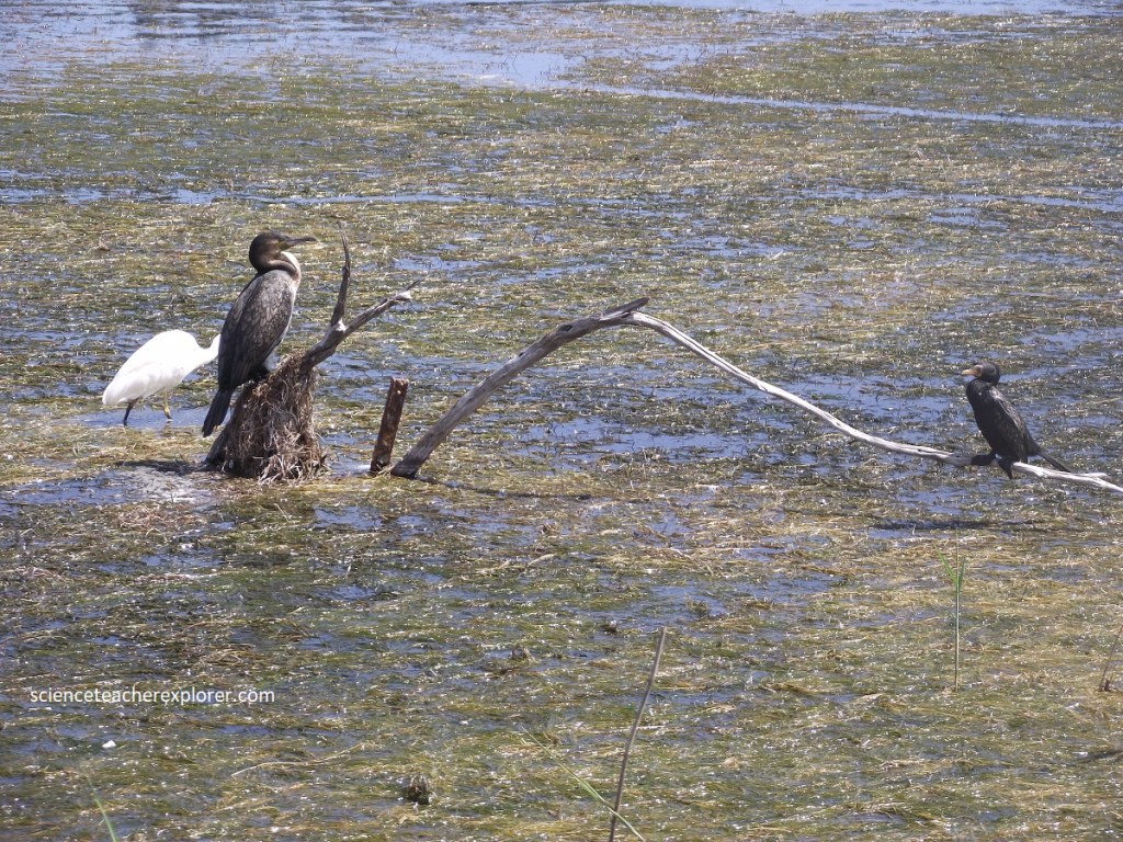 Pictured above, the White-breast Cormorant Phalacrocorax carbo is the largest of the cormorants in southern Africa. The white front extends from the chin to the breast. The Reed Cormorant Phalacrocorax africanus is noticeably smaller, slimmer and totally black. It is the smallest Cormorant in the southern Cape. They have a longer tail than the Cape Cormorant. I’ll ignore the Little Egret for now, since it darted behind the White-breast Cormorant.
