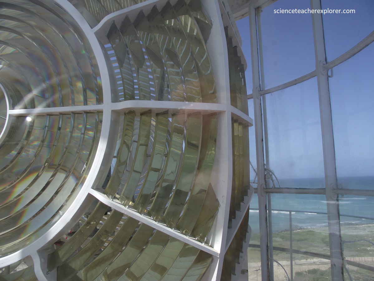 The most important development in Lighthouse engineering was the Fresnel lens, invented by the French physicist Augustin-Jean Fresnel in 1822 and which was made of ground and polished glass. These lenses provide highly concentrated beams and are produced as fixed, drum lenses, (this was a beehive shape), and rotating lenses. The glass lens design pioneered by Fresnel remains a principle element of the modern aid to navigation light. The Agulhas Lighthouse was of the “Dioptric” design. This meant that the prisms directing the light rays were refracted into a concentrated horizontal beam.
