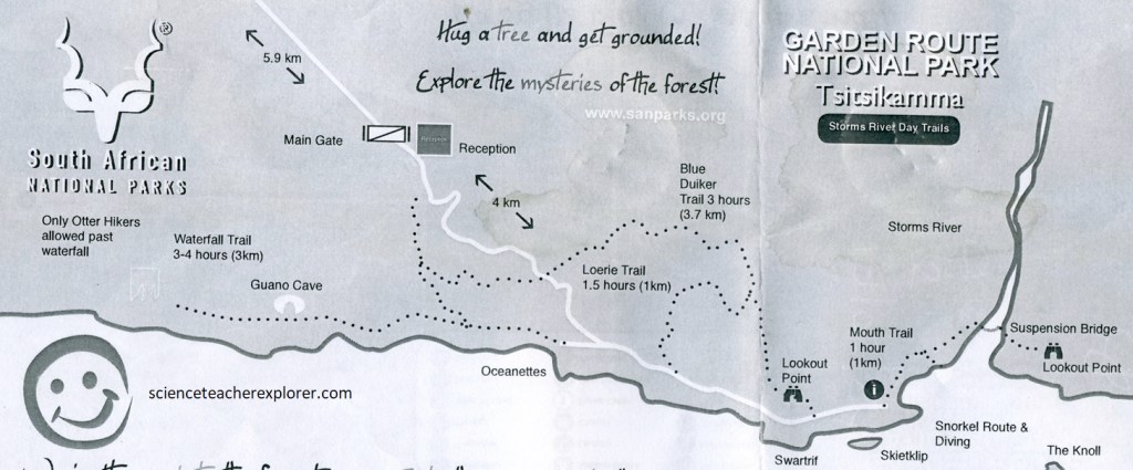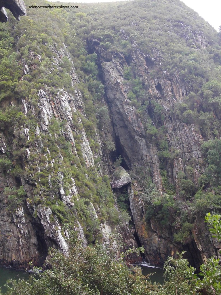 We continued onto our next destination, called the Storms River Gorge. A remarkable feature of much of the Southern Cape’s coastal landscape is the elevated plain that lies between the ocean and the mountains. In the Storms River area it is up to 7 km wide and is know as the Aberdeen Plain. It slopes very gently towards the ocean and ends in awesome coastal cliffs, and is dramatically and deeply incised in places by short coastal rivers.