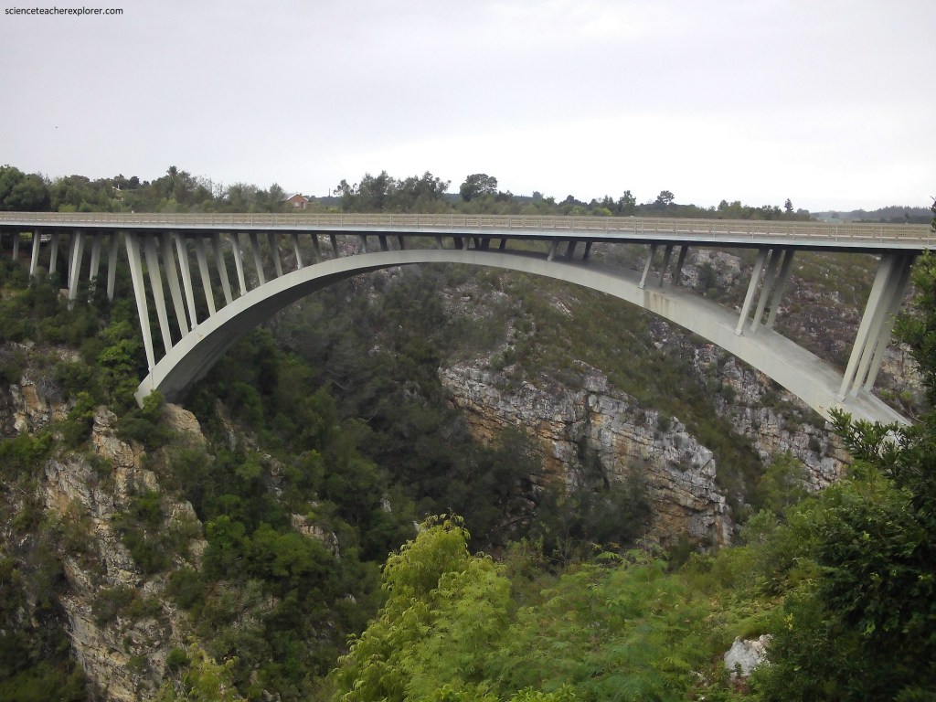 East of Plettenberg Bay the N2 highway crosses a remarkably flat plain that is cut at intervals by deep river gorges, now spanned by modern, high-level bridges. The old road was cut through almost impenetrable forests and followed steep winding pass through the Grootrivier, Bloukrans, and Storms river valleys. Pictured below, the Paul Sauer Bridge, which opened in 1956, spans some 100 m across the Storms River Gorge. It is firmly anchored in Table Mountain Group quartzite and was constructed in a cantilever style from both sides.