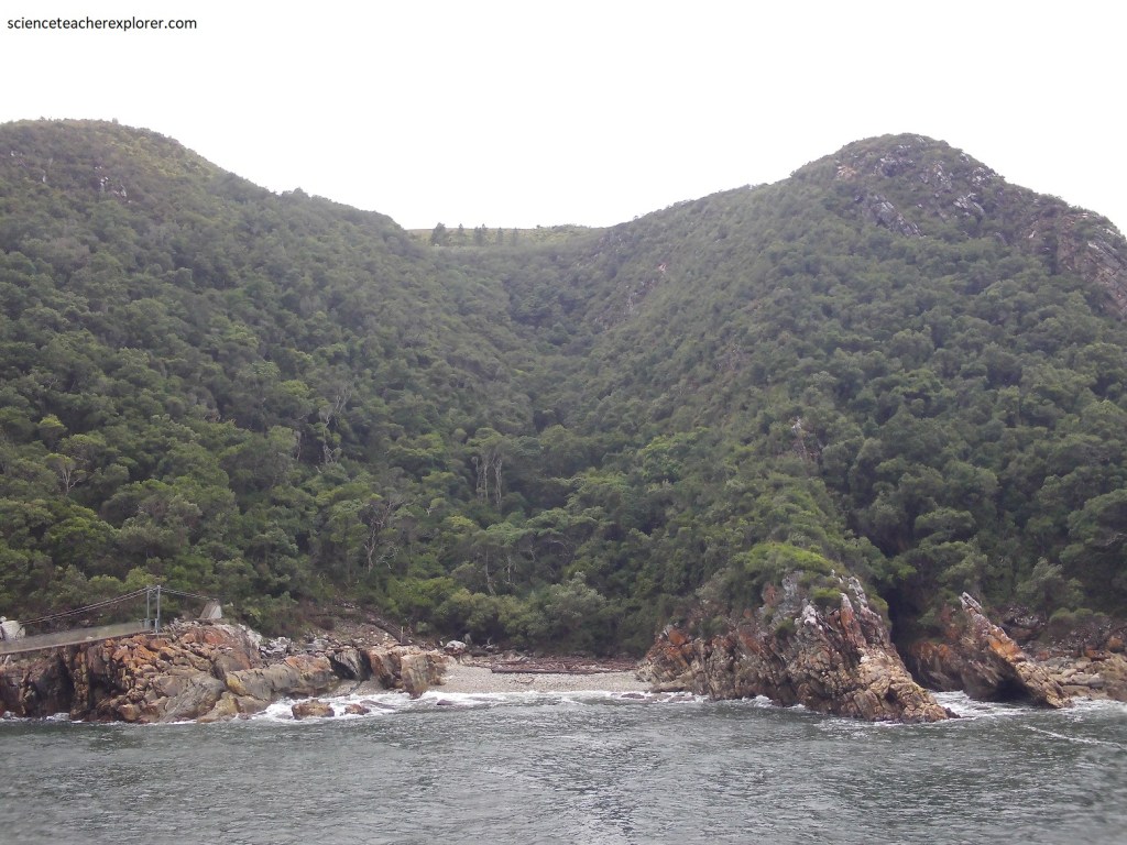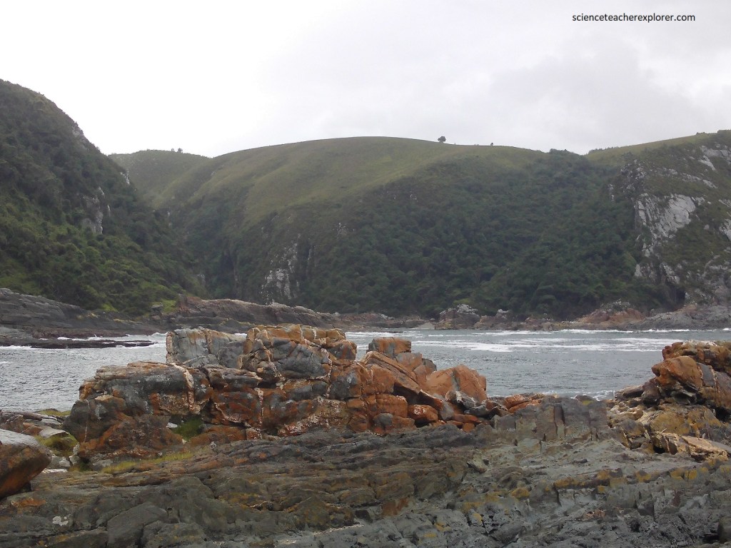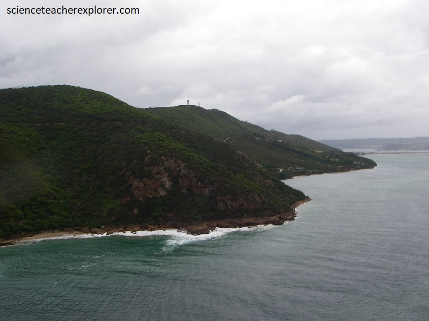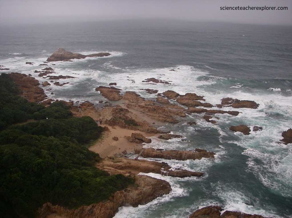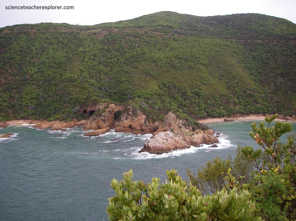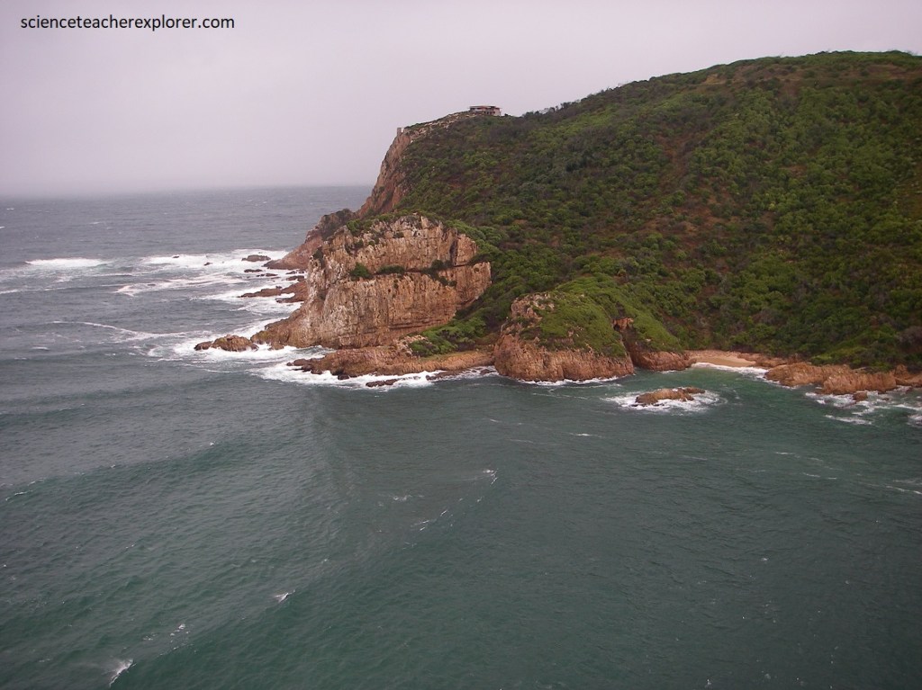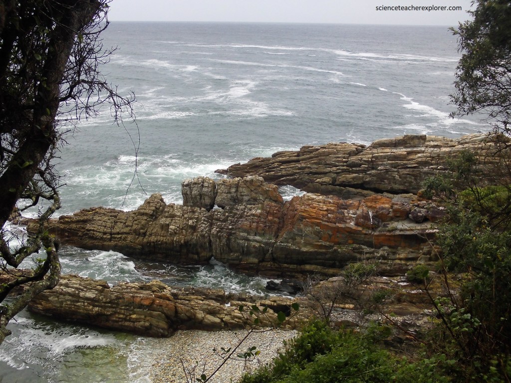 Pictured above, the mouth of the Storms River is on the left. The high ground in the distance is the now-elevated coastal plain, terminating in steep sea cliffs. Steeply dipping Table Mountain quartzite and siltstone are in the foreground.