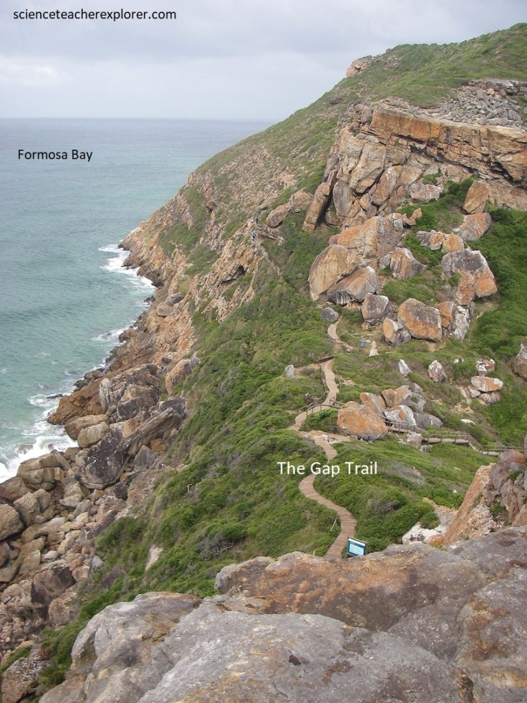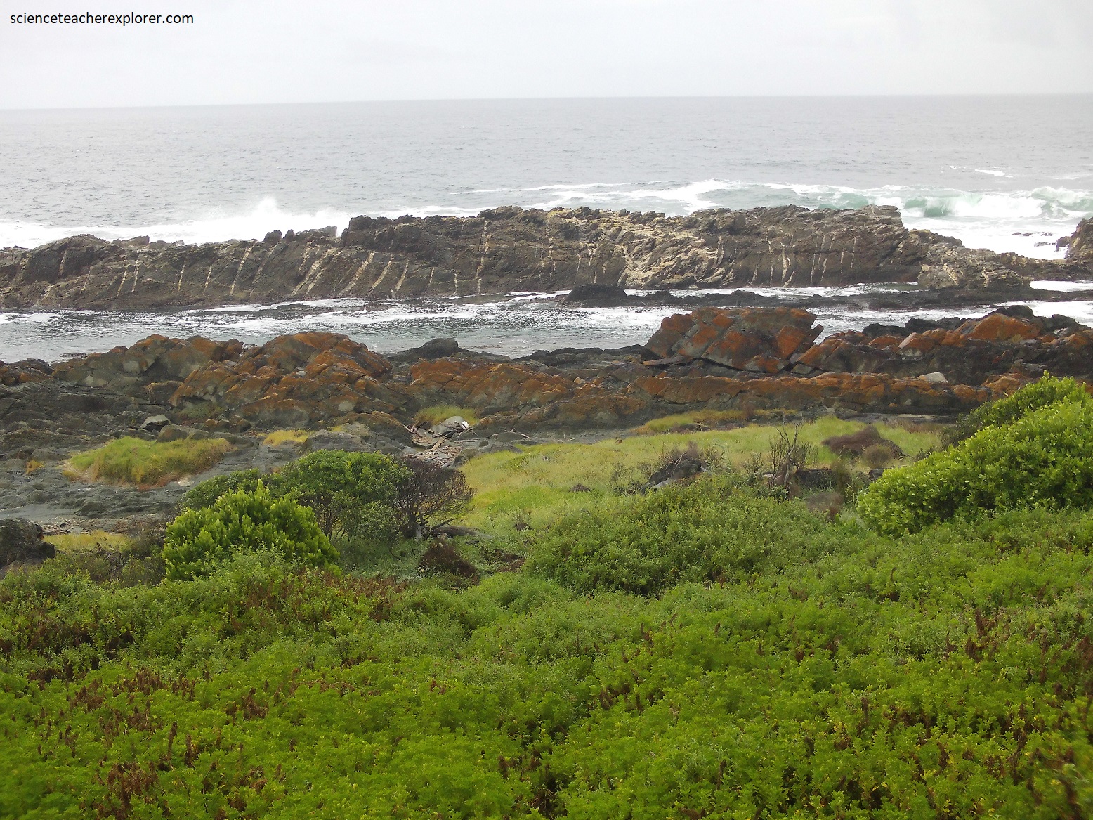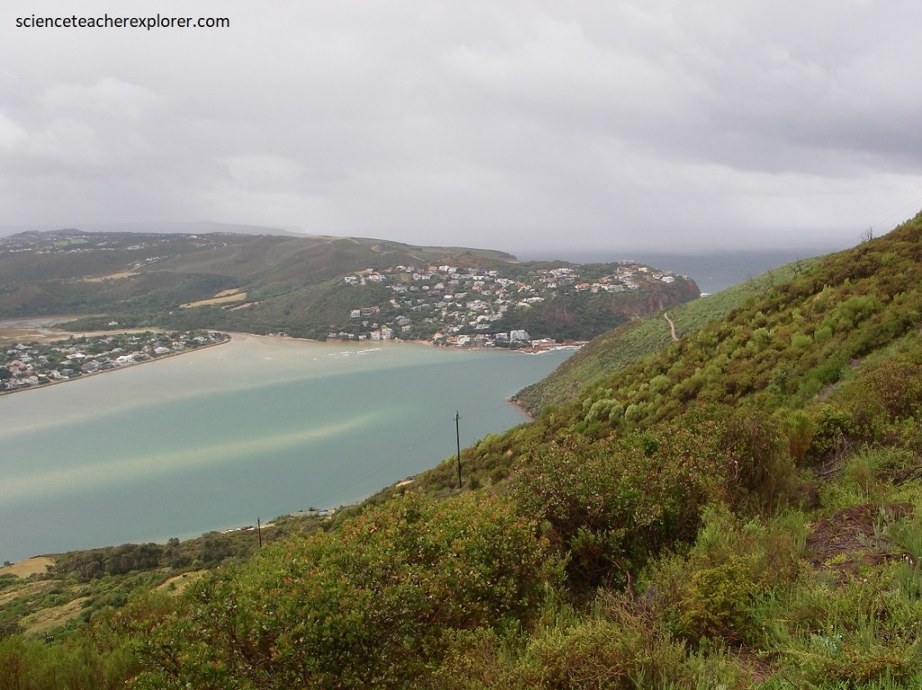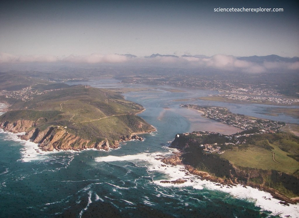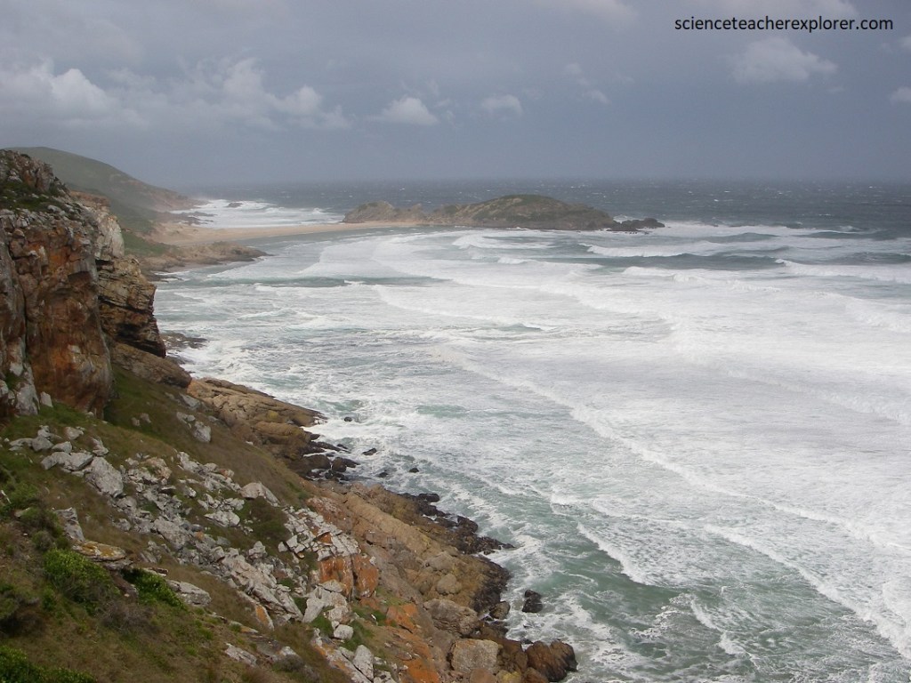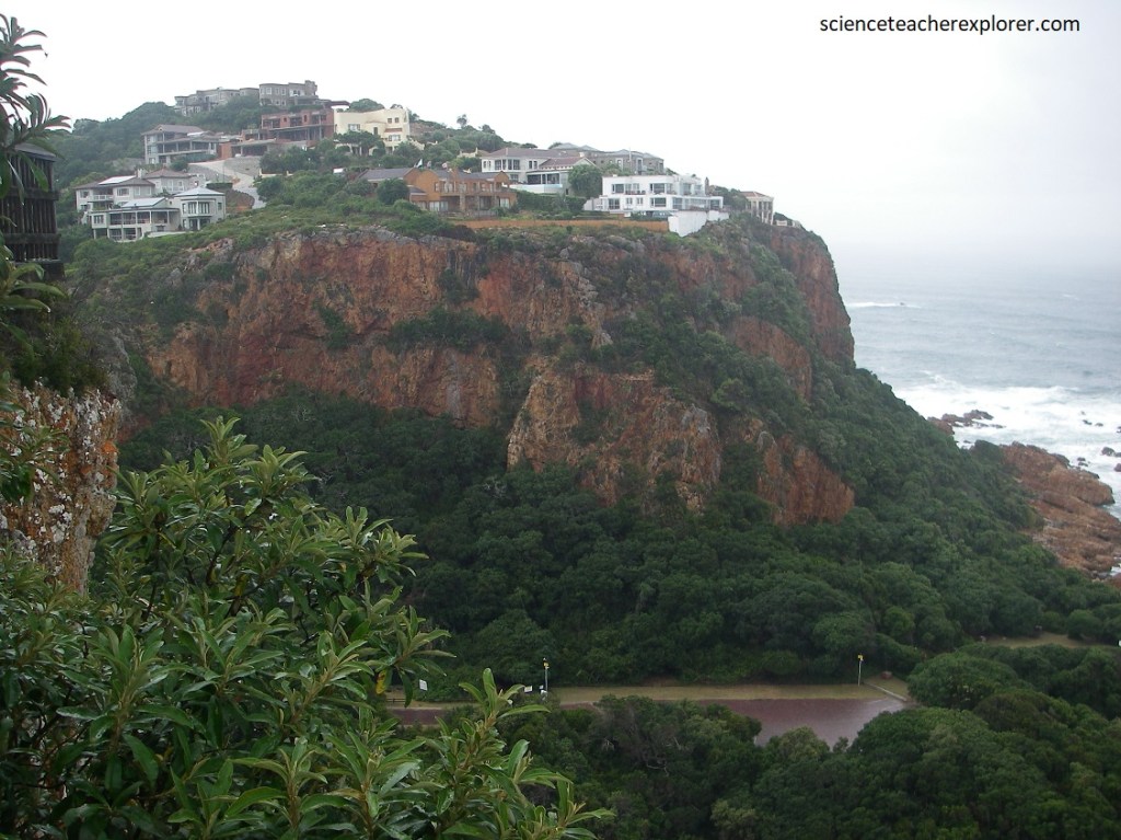 Pictured above, the mouth of the Storms River is on the left. The high ground in the distance is the now-elevated coastal plain, terminating in steep sea cliffs. Steeply dipping Table Mountain quartzite and siltstone are in the foreground.