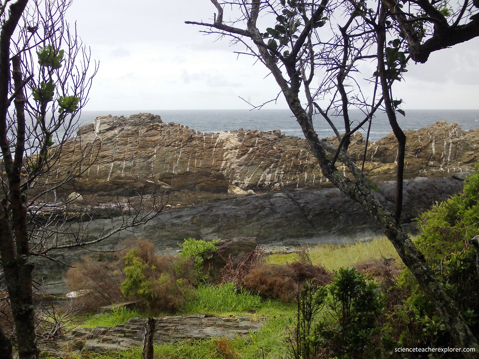 Pictured above, in places along the sea front rocks there are irregular white quartz veins that cut across or run parallel to the strata; there are rumors of gold occurring here along the start of the Otter Trail.
