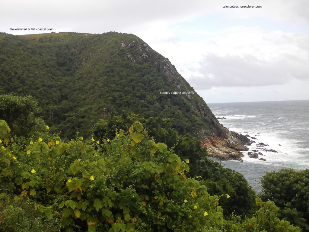 As mentioned above, at the rocky Tsitsikamma coast, the cliffs drop vertically into the ocean from a gently sloping plain about 200 m above sea-level.