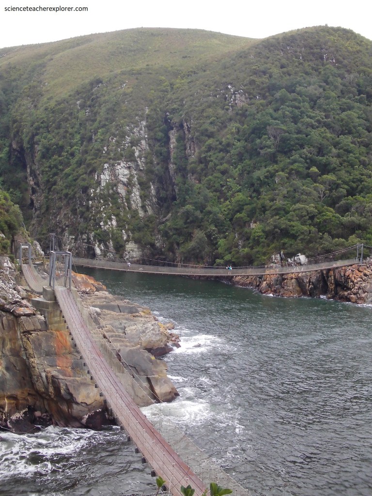 Pictured above, 3 suspension bridges have been installed over the Storms River Gorge Mouth. The main suspension bridge over the gorge is 77 long and 7 m above the water. It was built in 1969. The steeply south-dipping quartzite strata can be seen very clearly.