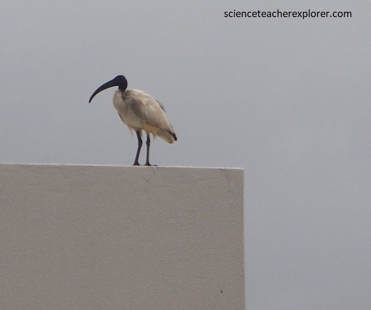 Pictured above, Sacred Ibis Threskiornis aethiopica is mostly white with a black head and neck and some black plumes in the tail. It has a long, slender, down-curved, black bill.
