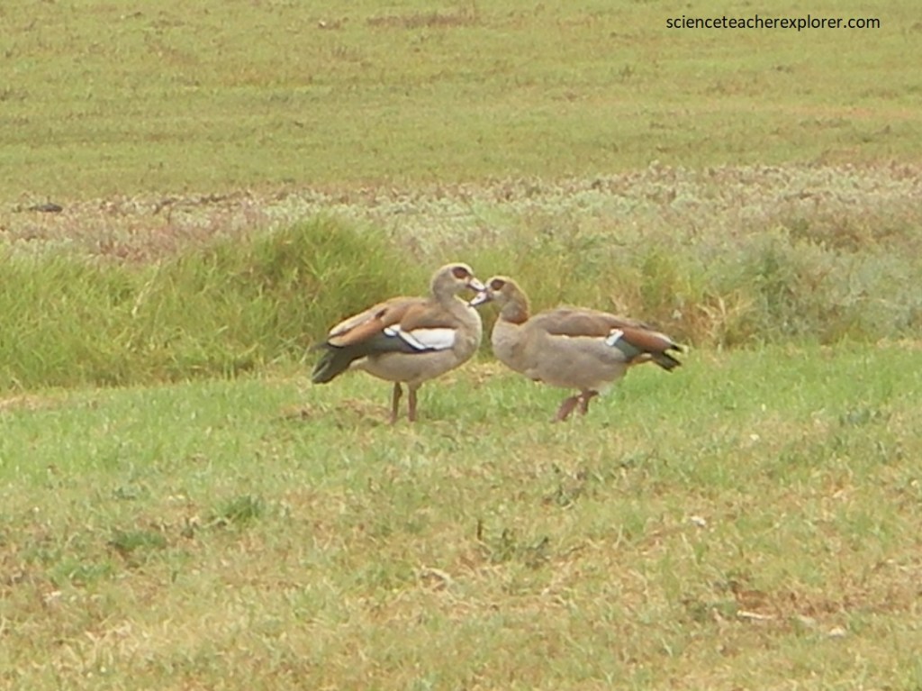 Pictured above, Egyptian Geese Alopochen aegyptiaca, where the dark brown patches around the eyes and on the center of the chest are characteristic. The legs and feet were red.
