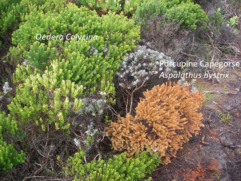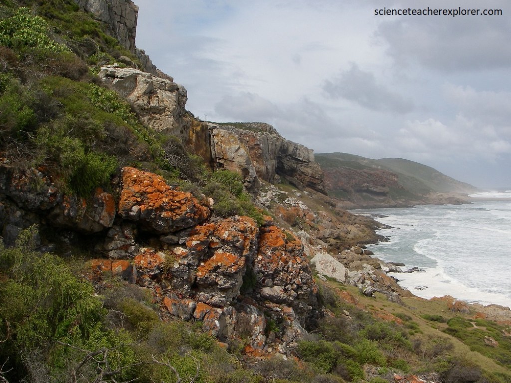 Pictured above, the elevated coastal plain is mostly underlain by strongly folded formations of the Table Mountain Group (exposed along the rugged coastline), part of the Cape Supergroup. These rocks were compressed and deformed during the formation of the Cape Fold Belt, resulting in a more or less east-west structural group.