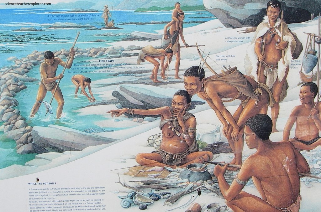 Found in these layers were of the following; LAYER 1 (Later Stone Age Khoikhoi pastoralists and San hunter-gatherers 300-2000 years ago): black musselcracker, strepie, mullet, yellowtail, galjoen, white stumpnose, red roman, elf, white steenbras, lipfish, red steenbras, brown mussels, perlemoen, white mussels, limpets, whelks, seal, dolphin, blue antelope, mongoose Cape buffalo, bushpig, bushbuck, dassie porcupine sheep, mountain reedbuck, grysbok, blue duiker, tanged stone-points & polished bone points. LAYER 2 (Later Stone Age San hunter-gatherers 2000-8000 years ago): Black musselcracker, elf, dassie, rod roman, kabeljou, white musselcracker, rock cod, yellowtail, silverfish, white steenbras, brown mussels, black mussel, limpets chiton, perlemoen, pencil bait, white mussels, periwinkles, alikreukel, whelks, venus ear, slipper limpet, dolphin, seal, dassie, blue antelope, mountain reedbuck, hippo, porcupine, bushpig, waalribbok, grysbok, bushbuck, Cape buffalo, mountain reedbuck, grey duiker, mongoose, micro-lithis stone tools, stone sinkers, polished bone points, decorated bone tubes, bone rings, ostrich eggshell pendants, ostrich eggshell beads, shell pendants, painted stones & human remains. LAYER 3 (Later Stone Age ancestors of San hunter-gatherers 8,000-12,000 years ago): hottentot, silverfish, red roman, dassie, black mussel, white steenbras, white musselcracker, yellowtail, elf, klip-fish, brown mussels, perlemoen, white mussels, limpets, alikreukel, periwinkles, whelks, chiton, dolphin, seal, mountain reedbuck, bushpig, oribi, southern reedbuck, klipspringer, bushbuck, roan, grysbok, vaalribbok, eland, wharthog, porcupine, dassie, mongoose, blue antelope Cape buffalo, hippo, medium and large scrapers, & polished bone tools. LAYER 4 (Later Stone Age ancestors of San hunter-gatherers 12,000-20,000 years ago): Extinct giant buffalo, warthog, extinct giant hartebeest, ostrich, wildebeest, extinct springbok, mongoose, southern reedbuck, eland, klipspringer, quagga, dassie, porcupine, bushpig, bontebok, roan, bladelets and cores, large and small scrapers. LAYER 5 ( not occupied 20,000-50,000 years ago). LAYER 6 (Middle Stone Age ancestors of San hunter-gatherers 50,000-120,000 years ago): Triangular stone points and stone segments.