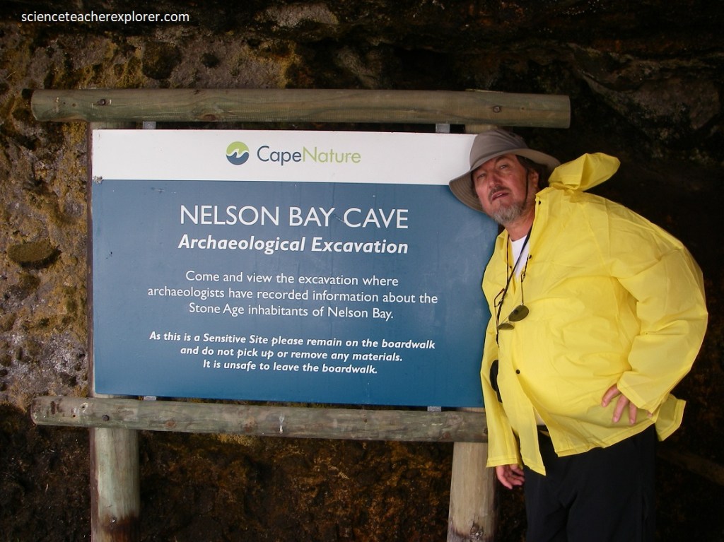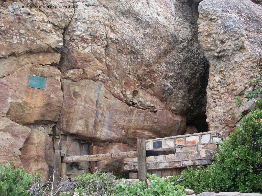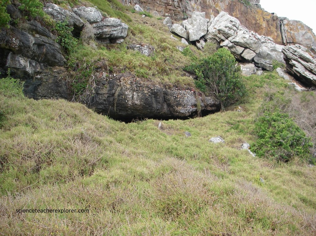 Mike and I trekked down the steep slope of the south side of Robberg Peninsula. This brought us to the famous archaeologically excavated Nelson Bay Cave, which was formed in angular quartzite breccia of the Robberg Formation by erosion from the ocean, (pictured below). It was occupied by early humans as far back as 120,000 years ago.