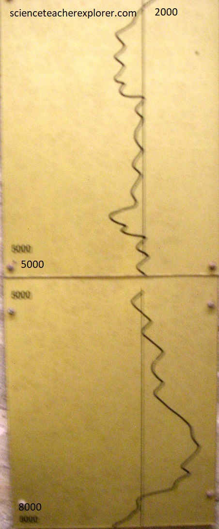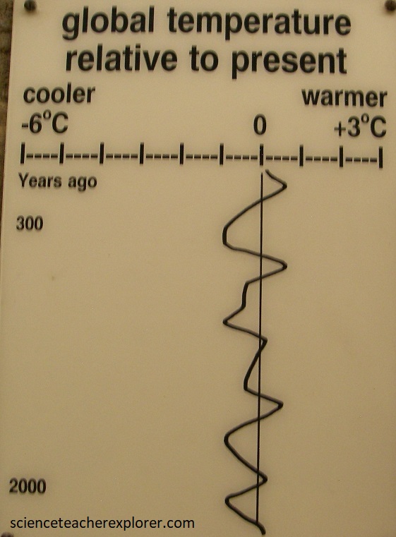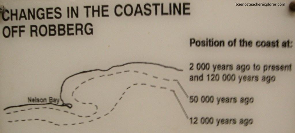 Imaged above from an interpretive sign on-site, Global temperatures have changed considerably over the time period when Nelson Bay Cave was occupied by Stone Age people. This curve is the result of the analysis of hundreds of cores taken from sediments on the ocean floor in many parts of the world. It records the amount of global ice and therefore temperature changes over the past 125,000 years.