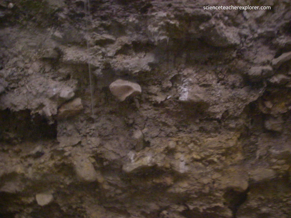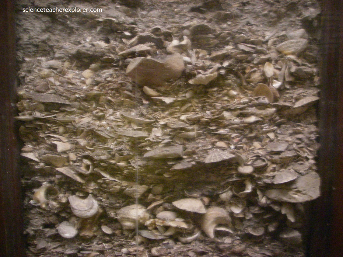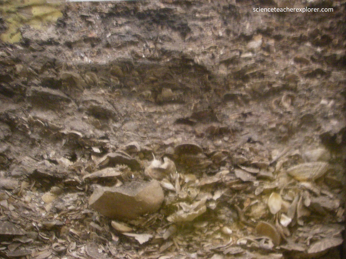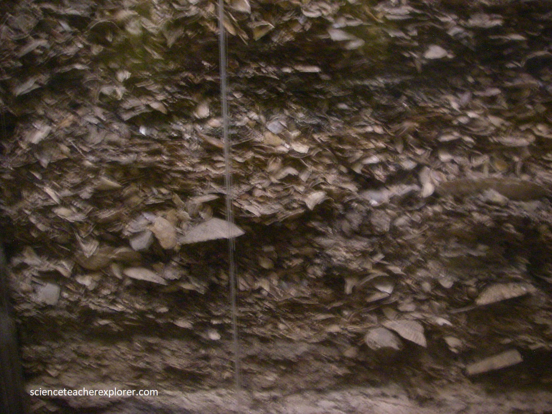 Pictured above from behind a glass panel from on-site, are consecutive sections through the deposits, We could see the layers of shells, bones and stone tools left here at different times in the past.