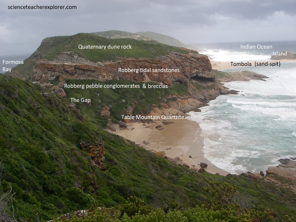 Before the Robberg sediments were deposited there was a rugged, scarp-like ridge made of hard, south-dipping Table Mountain quartzite, (pictured above).