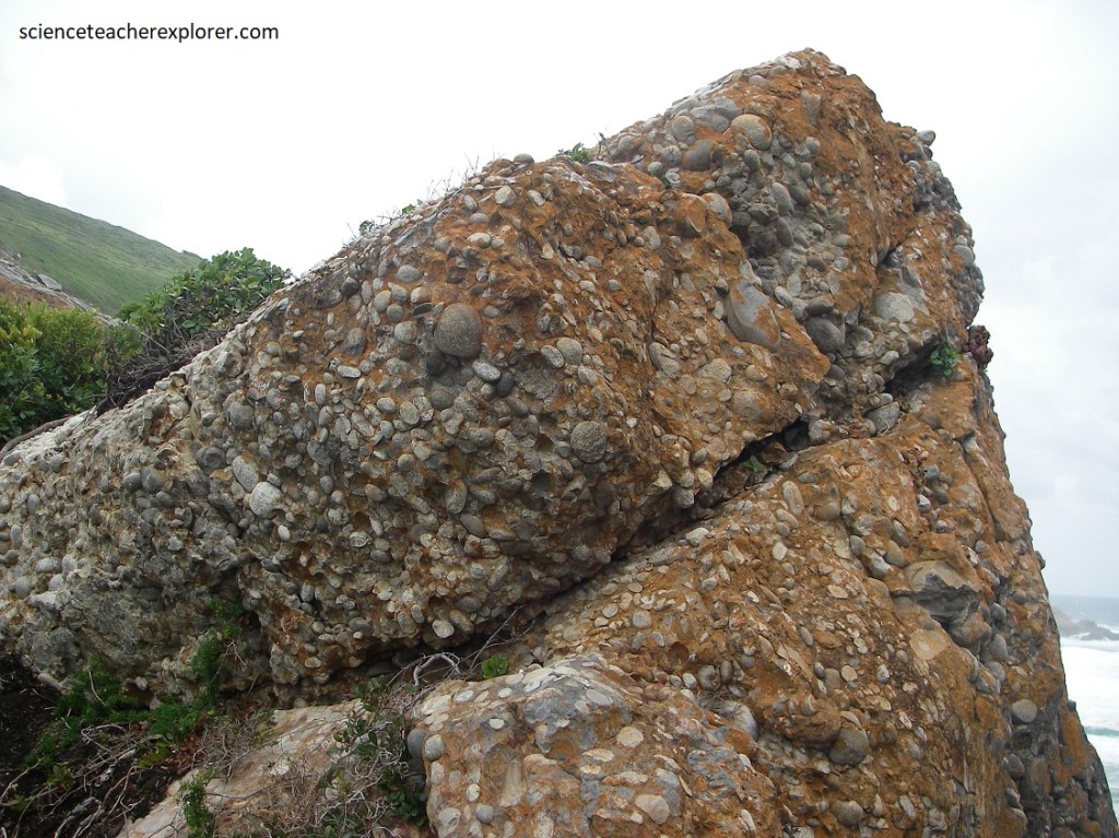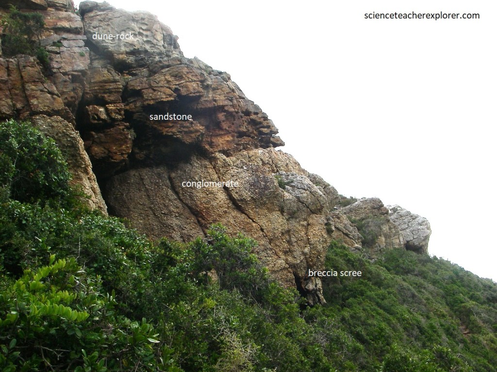 Pictured above, strong coastal erosion of the Table Mountain quartzite ridge, (mentioned above), first formed deposits of unsorted rock debris (scree) that accumulated close to its source area. The scree hardened to form a lower breccia of angular quartzite fragments cemented within a fine-grained matrix.