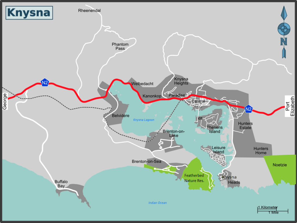 33 km westward on N2 from Plettenberg Bay is Knysna. Pictured below, the tide enters Knysna’s estuary by surging through a narrow channel flanked by two spectacular headlands.