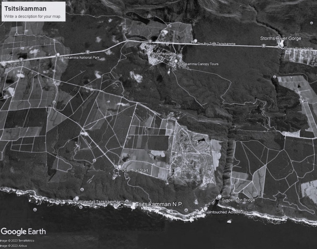 The region south of the Tsitsikamma Mountains is well known for its rugged coastline, indigenous coastal forest and the famous 50 km long Otter Trail. Pictured above, the incredible Storms River Gorge, (one of several deeply incised valleys that cuts through the coastal plain), heads toward the ocean nearby.