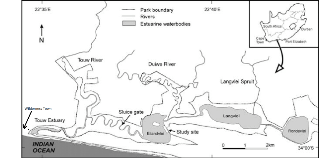 Pictured above, Wilderness Lakes are shallow lagoons, (sometimes called estuarine lakes), rather that true lakes, and were formed by the infilling of the estuary by sediment, either deposited by the river or by wind-blown sand. Eilandvlei Lake was formed as a submerged lowlands between sand dunes. It was then flooded by the rising levels of the Indian ocean, which was not connected to any river system at that time.