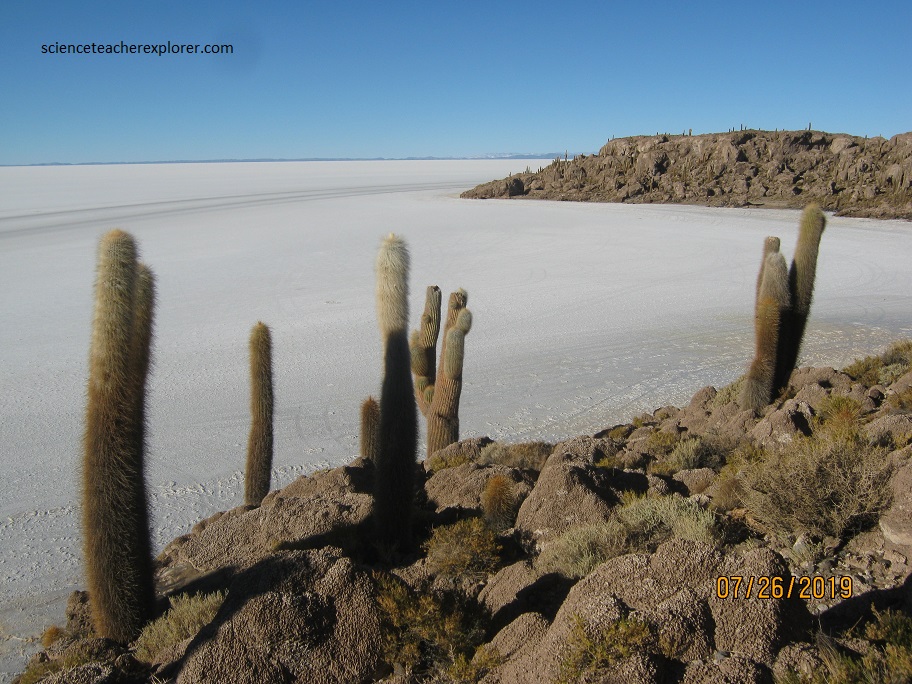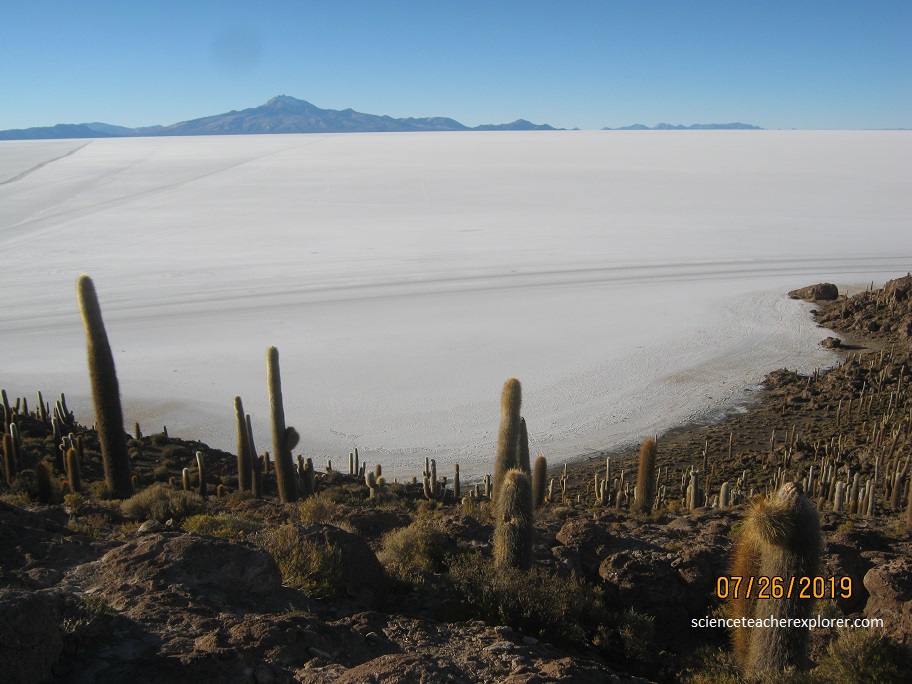 Bolivia’s (and the world) largest salt deposit, this huge miner flat also includes fields of chalky gray gypsum and is peppered with islands of mountains. One of our destinations for the day, is to drive to the Isla Incahuasi, (pictured below).