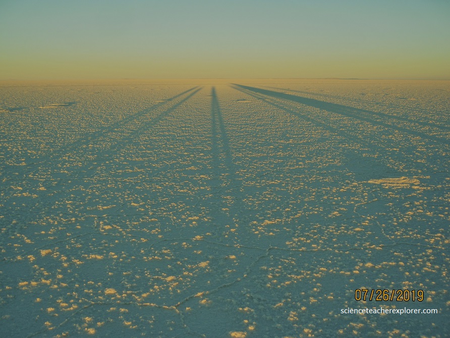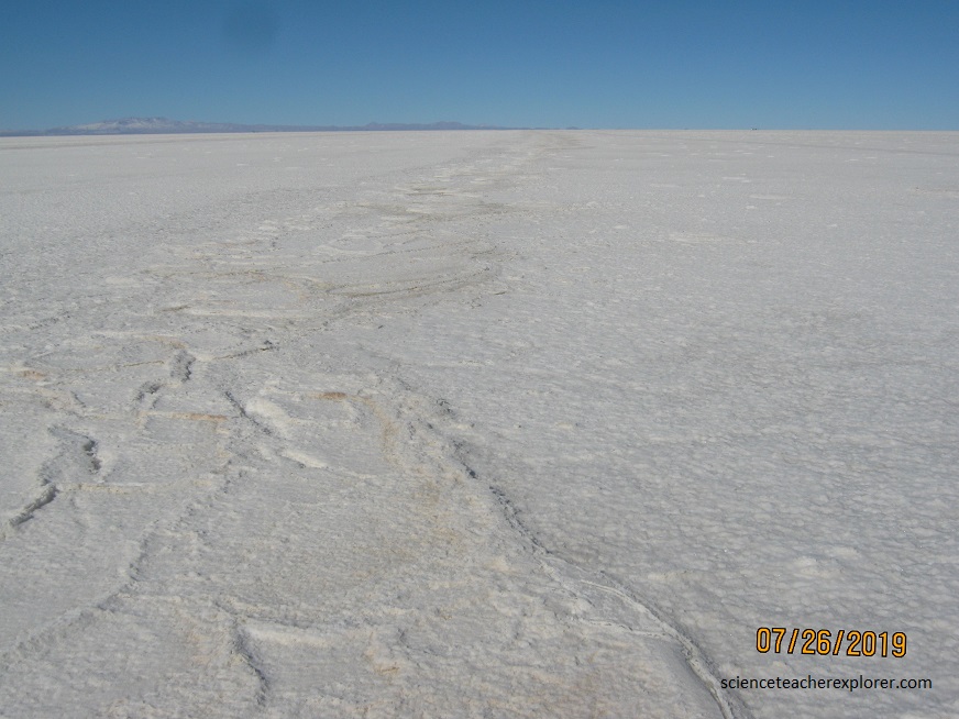 A closer look at what is known as the Salar de Uyuni, however, reveals surviving relics of shallow water underneath the crust sodium chloride camouflaged by a fine desert dust.