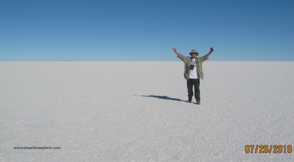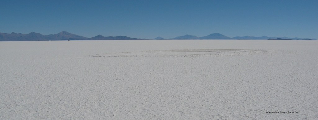 The Salar de Uyuni is so big, you can witness the curvature of the earth. In 8 km of distance the earth drops 5 m. The mountains in the far distance, seem to disappear. The large area, clear skies, and exceptional flatness of the surface make the Salar ideal for making a couple of videos with special-effects below.