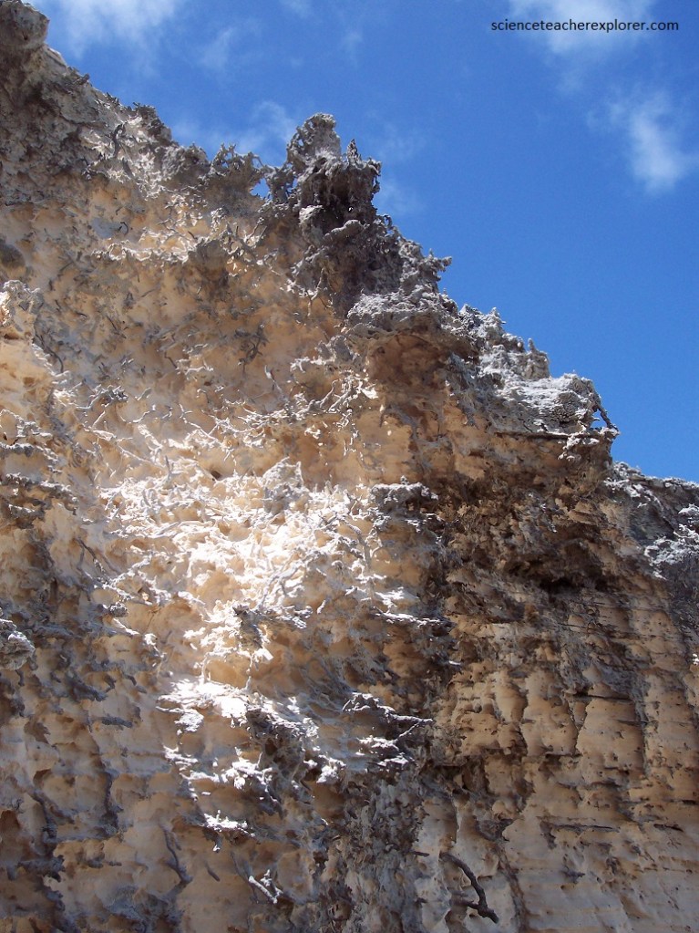 Pictured below, the pitted surfaces covers much of the ground surface of San Salvador Island’s interior. Rainwater charged with carbon dioxide lands on the bare rock and collects in small depressions. Dissolution enlarges these. Because the rock surface is impermeable, water does not infiltrate.