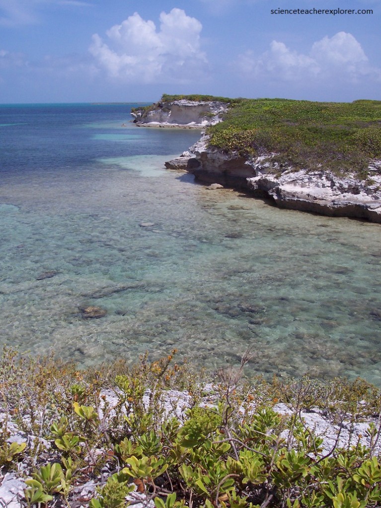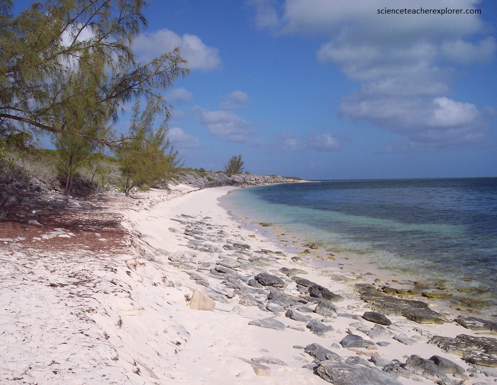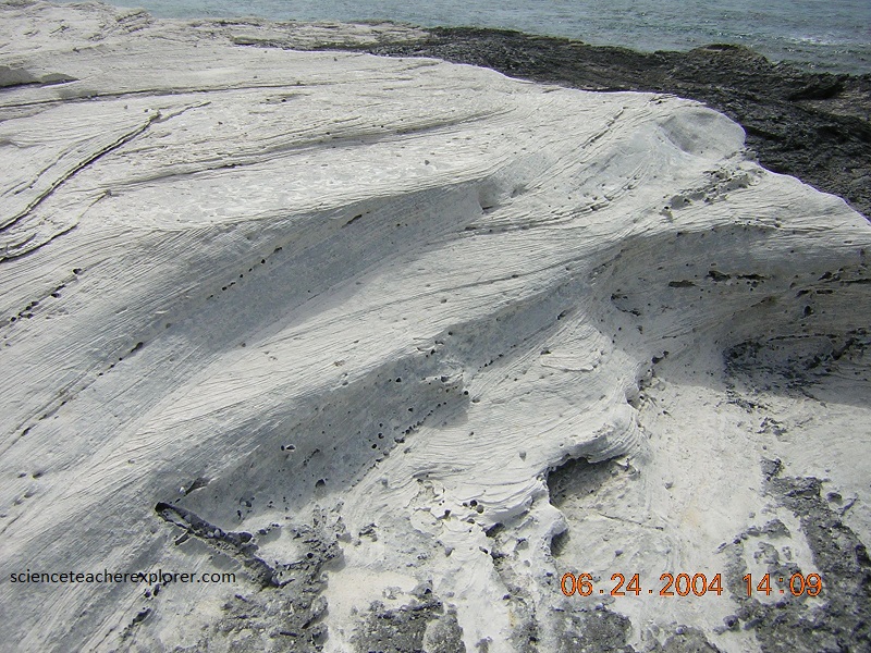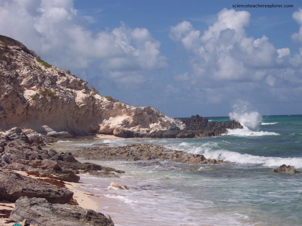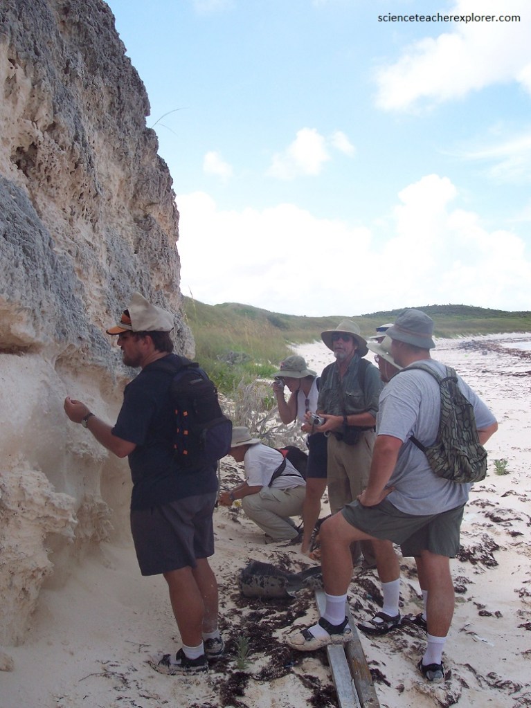 Pictured above, I’m looking at the contact zone between to the two members of the Holocene “Rice Bay Formation”. The top layer, “Hanna Bay Member”, is the youngest bedrock unit on San Salvador Island. This well-sorted limestone consists of sand-sized grains of aragonite or calcarenites. When examined microscopically, the calcareous sand grains can be seen touching each other, (grain-supported). Here at Rice Bay, the bedding has a seaward dip. The rocks at this shoreline outcrop range from representing beach facies to back-beach dune facies. The lower white layer is the slightly older “North Point Member”. It consists of eolian, aragonitic calcarenites.
