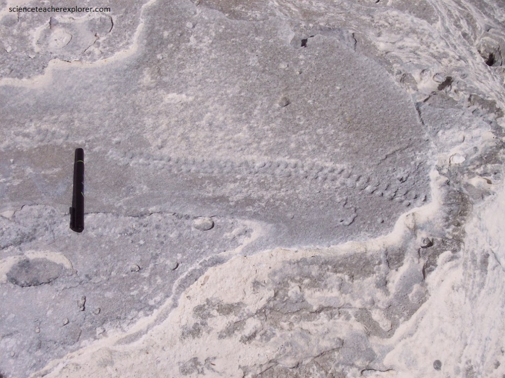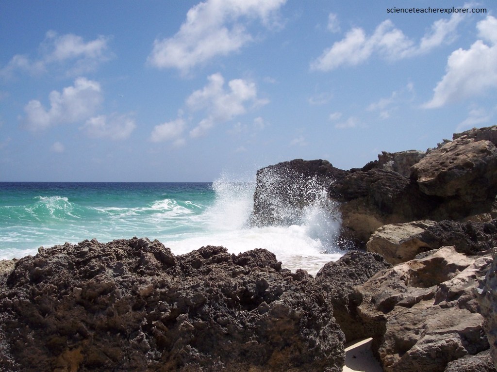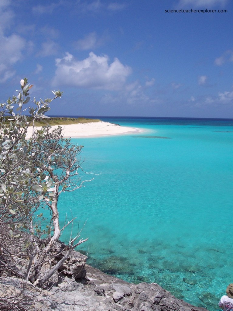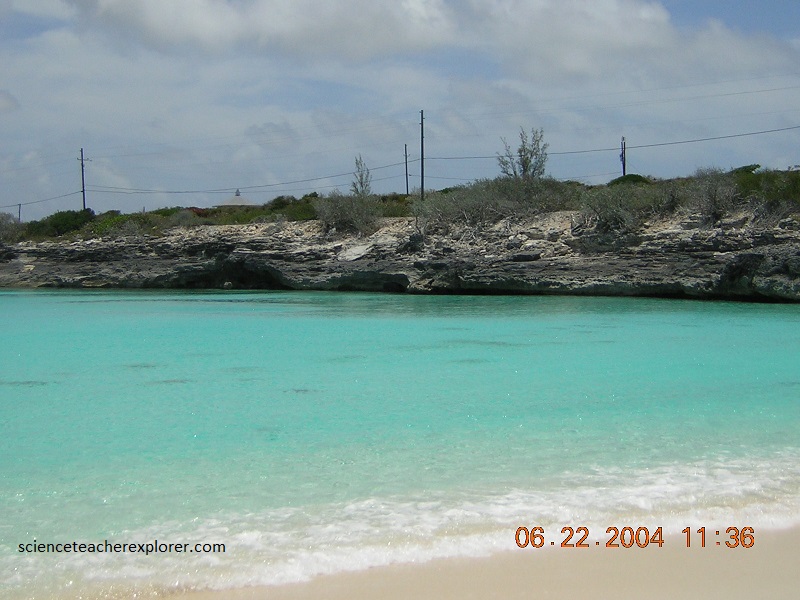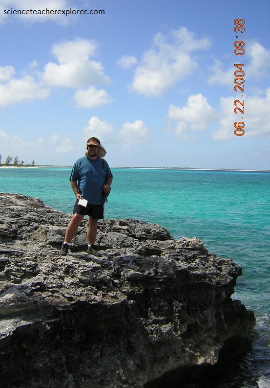 Pictured above, I’m looking at the contact zone between to the two members of the Holocene “Rice Bay Formation”. The top layer, “Hanna Bay Member”, is the youngest bedrock unit on San Salvador Island. This well-sorted limestone consists of sand-sized grains of aragonite or calcarenites. When examined microscopically, the calcareous sand grains can be seen touching each other, (grain-supported). Here at Rice Bay, the bedding has a seaward dip. The rocks at this shoreline outcrop range from representing beach facies to back-beach dune facies. The lower white layer is the slightly older “North Point Member”. It consists of eolian, aragonitic calcarenites.
