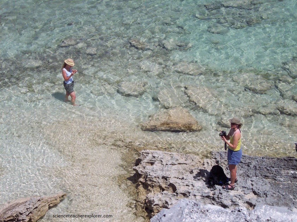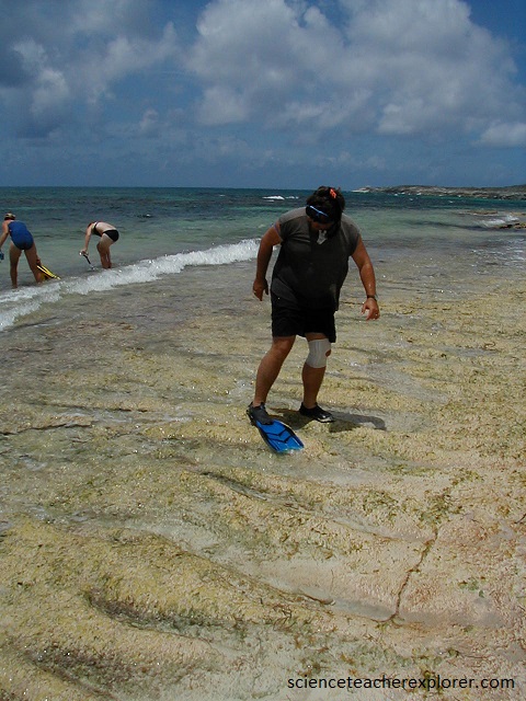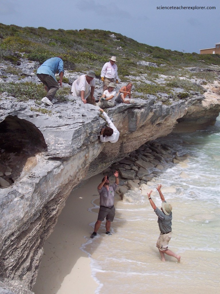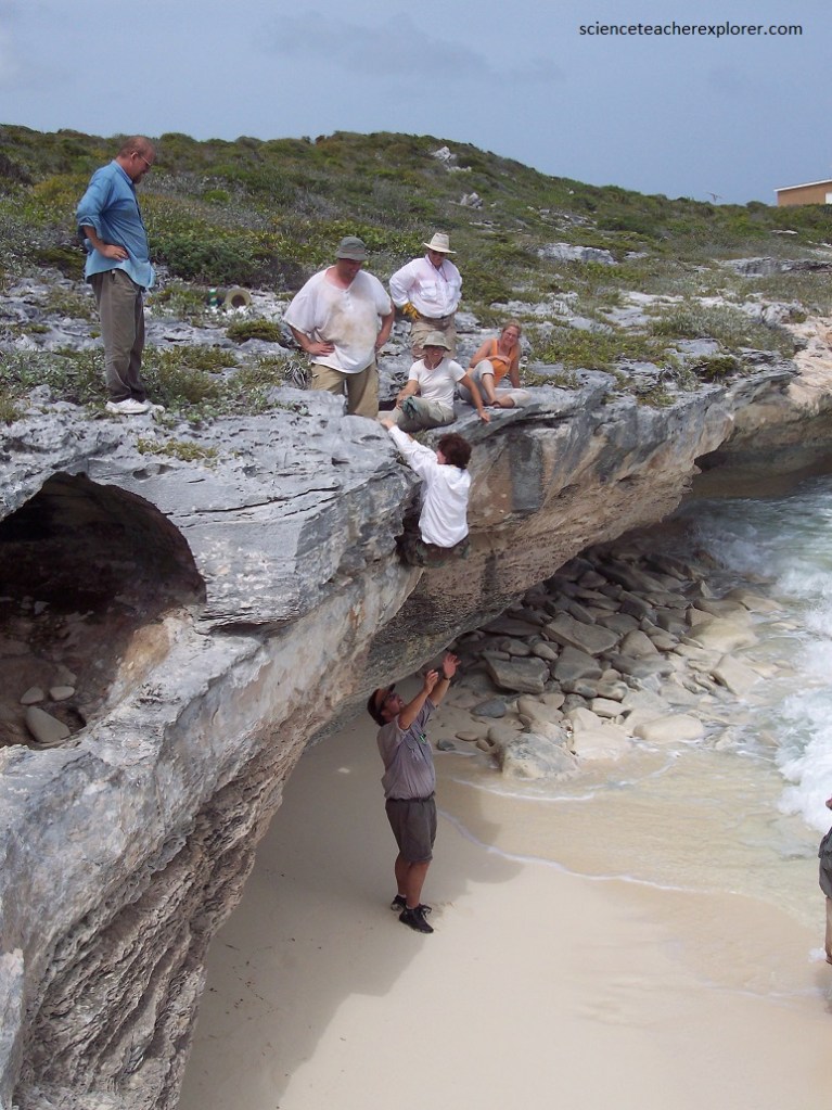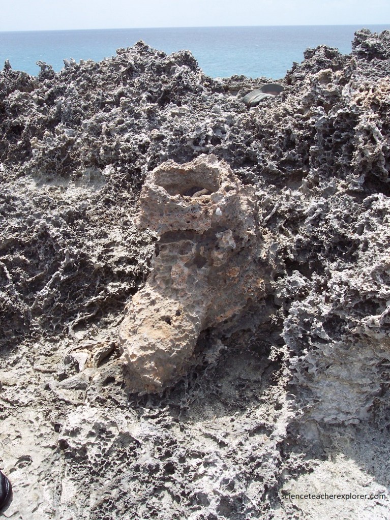 On the last few days of my scientific expedition of San Salvador Island was spent exploring the rugged phytokarst coastline. Pictured above, is one of the challenges we had exploring the shorelines of the island. Much of the Island surface was covered with a phytokarst limestone. A “phytokarst” is a irregular, sharp-edged, small-scale karst that is developed on most exposed limestone surfaces. Phytokarst is the result of several inorganic and biologic processes. These include preferential cementation of otherwise unlithified young limestones by sea spray, differential dissolution by slightly acidic rainwater, cyanobacterial & algal boring activities, and gastropod radular scraping.
