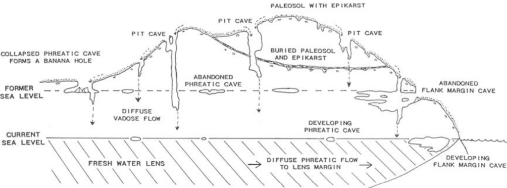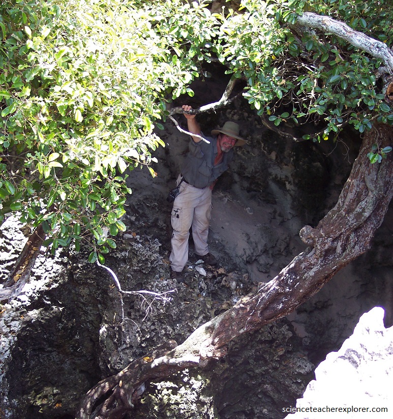 According to Dr. Mylroie, “There are four main types of caves in the Bahamas: pit caves, flank margin caves, banana holes, and lake drains. Our first exploratory mission was a “pit cave & a “flank margin cave”, on San Salvador.