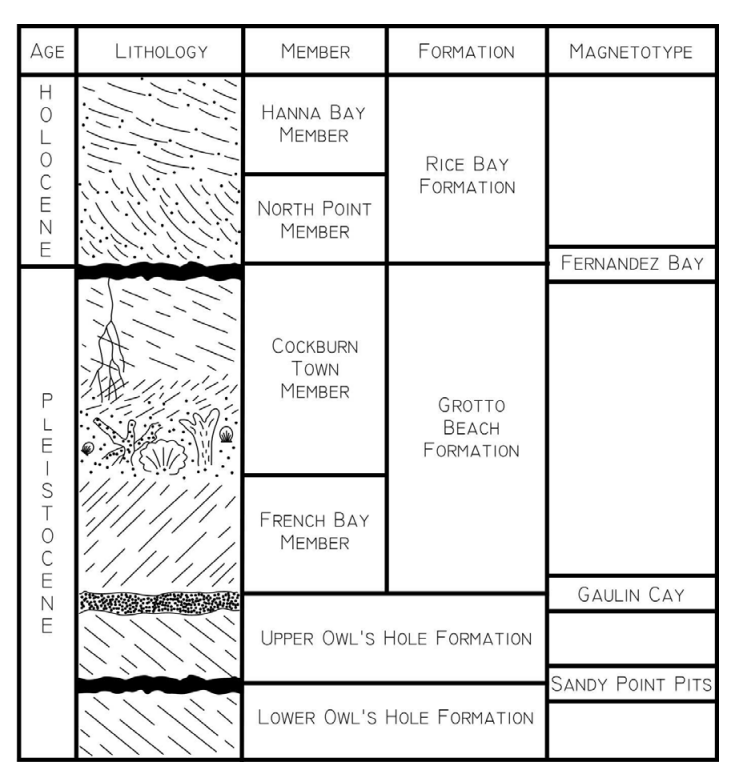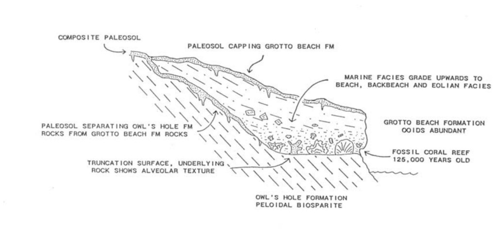 The upper 8 m of the Owl’s Hole Pit Cave consisted of eolian aragonitic oolitic calcarenites of the Grotto Beach Formation. The lowest 2 m consisted of eolian aragonitic bioclastic calcarenites of the Owl’s Hole Formation of the Middle Pleistocene. A calcrete paleosol separated the two units.