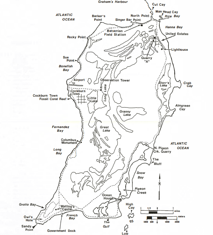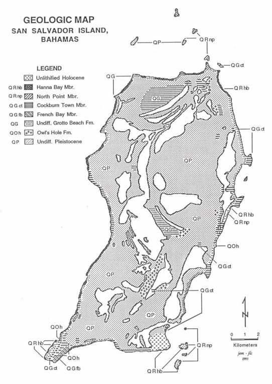 San Salvador is a small island, about 11 km wide by 19 km long, and is bordered by a narrow shelf with an abrupt shelf-edge break leading to a very steep slope. The topography of the island is dominated by curved ridges that probably represents successive stages of carbonate eolioan (or wind) accretion.