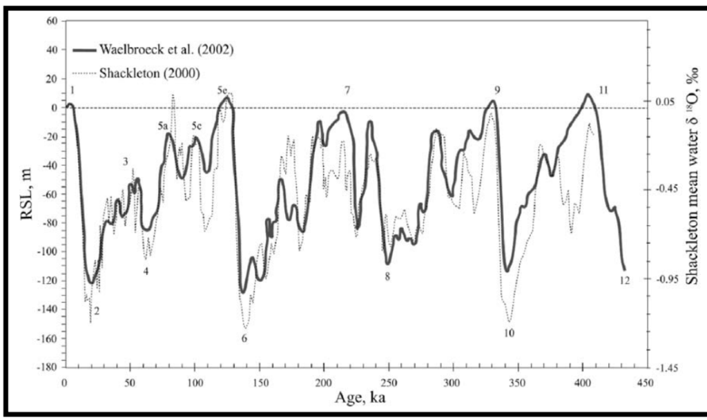 Imaged above, changing sea level changes the dissolution location resulting in caves at many different levels. During the Pleistocene glaciations, sea levels changed considerably. They have been as much as 6 m above present (about 125,000 years ago) to about 125 m below (about 70,000 years ago). These fluctuations had a considerable impact on the size of the other Bahamian islands and location of cave formation. However, because of its steep-walled, isolated platform, the size of San Salvador changed little.