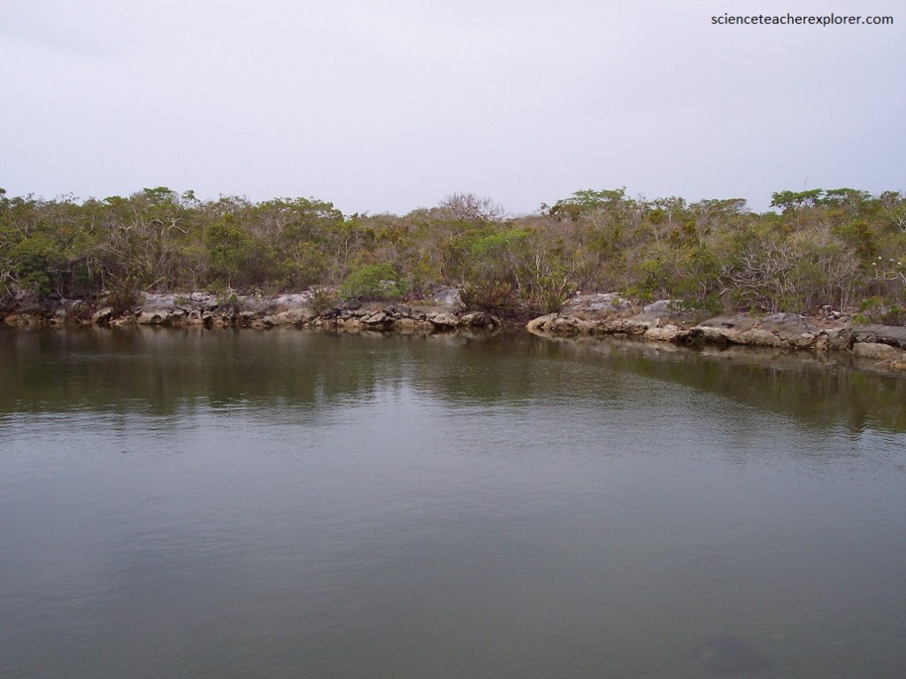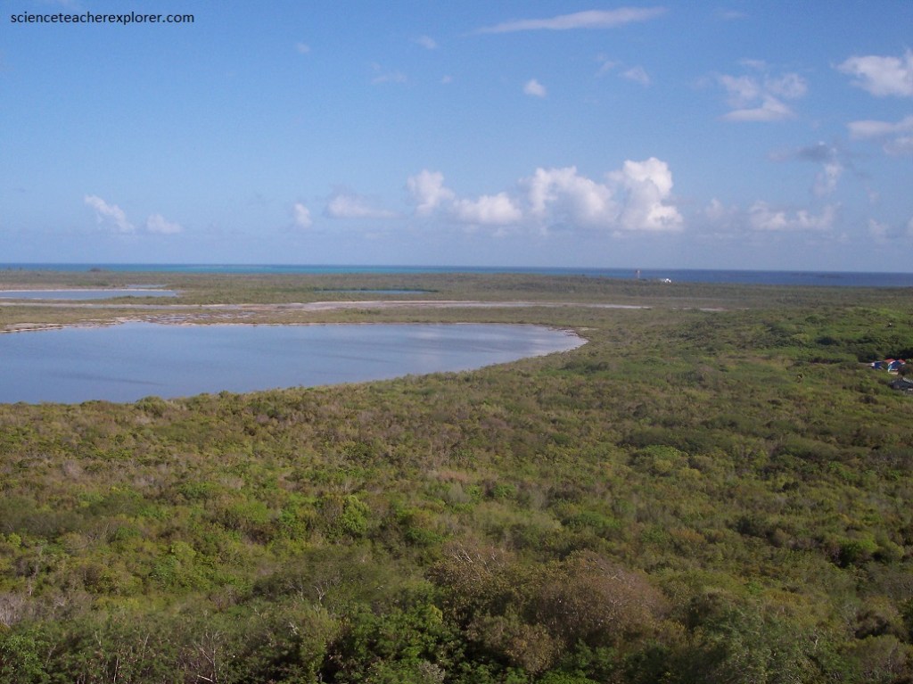 Pictured above, Watling’s Blue Hole is a shallow blue hole near Watling’s Castle on the southern tip of San Salvador Island. It has a fresh/brackish water lens about 3 m thick floating on an underlying salt water body. The presence of the non-marine water at the surface promotes vegetation. The collection of organic matter in the upper water layer has stained the water dark with tannin, which changes the blue color to a dark green. The surface waters have a salinity of 5.20 ppt, indicating it is about 13.7% seawater.
