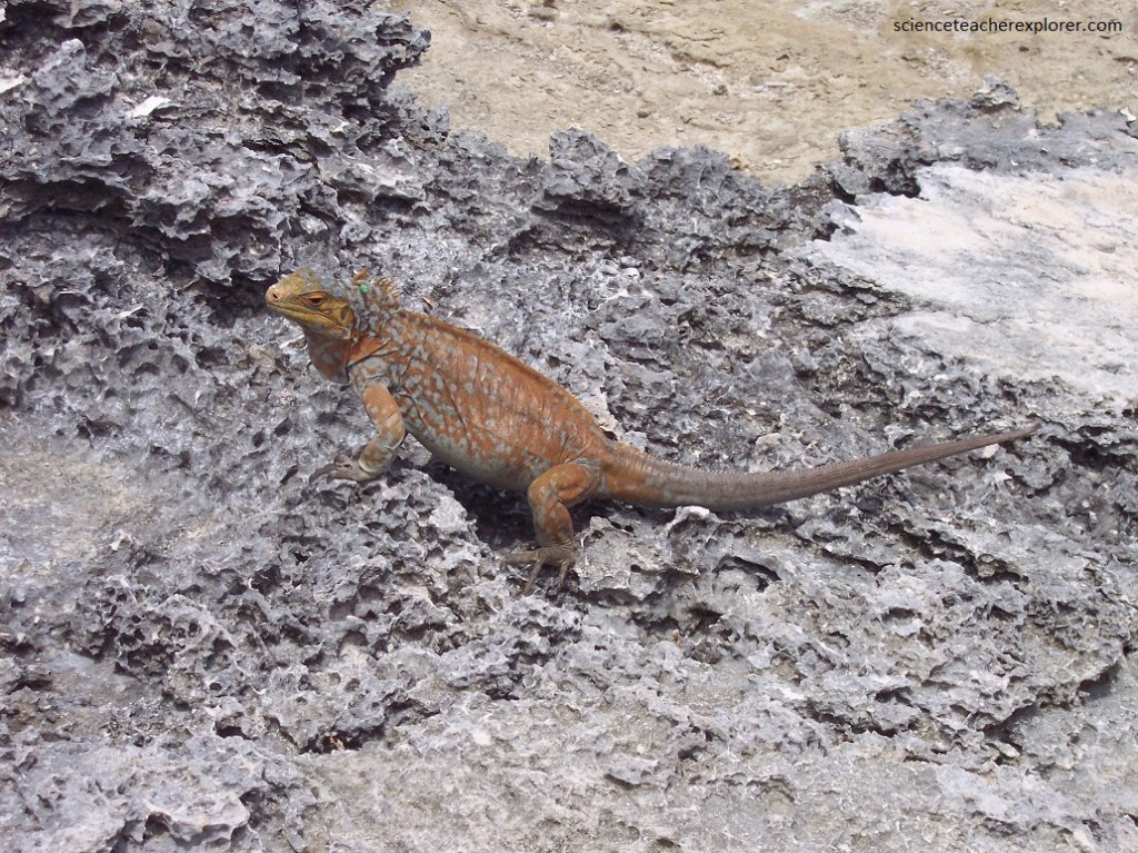 Pictured above, the “San Salvador Rock Iguanas” on Green Cay, western Graham’s Harbour, offshore from northwestern San Salvador Island. The reptile is one of the rarest reptile species on Earth. The species is sexually dimorphic and herbivores; females have a smaller body size and small dorsal crests (see above), while males are larger and have more prominent dorsal crests. Population estimates in 2004 was only a few hundred individuals that exist on earth.