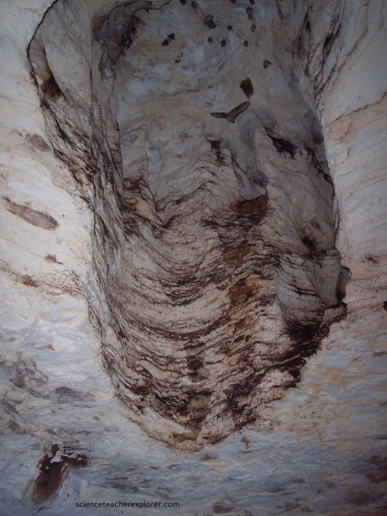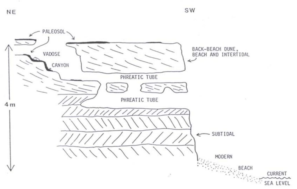 Pictured above and below, Lighthouse Cave is hosted in eolian, cross-bedded, aragonitic calcarenite limestones of the Owl’s Hole Formation of the middle Pleistocene. As mentioned above, Lighthouse Cave is a flank margin cave. In the vicinity of the seawater-freshwater mixing zone (halocline) of a groundwater lens, relatively rapid dissolution of limestone occurs. Limestone dissolution at this cave occurred during 119,000 to 131,000 years ago.