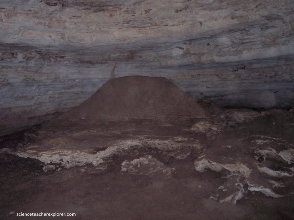 Pictured above, another flank margin cave that we explored was the “Altar Cave” on the southwestern part of San Salvador Island. Altar Cave is hosted in aragonitic, oolitic calcarenite limestones of the Cockburn Town Member of the Grotto Beach Formation of the Upper Pleistocene. This cave was nearly an intact, breached flank margin cave. Altar Cave was erosionally intercepted by the development of a wave-cut, paleo-sea cliff formed during the mid-Holocene, at about 5000 years ago. Altar Cave consisted of one main chamber. Pictured above, a large mound of travertine speleothem occurs near the northeastern corner of the main chamber and somewhat resembles a ceremonial altar. The cave entrance was low and required crawling. The entrance passage had a sand-covered floor and the bedrock floor occurred at up to 2 m below the present sediment-covered cave floor.
