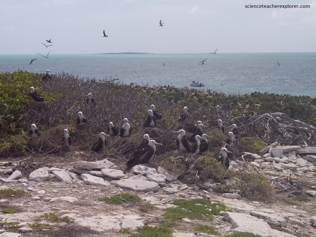 Fregata magnificens Mathews, 1914 – magnificent frigatebird nesting colony on Catto Cay in Grahams Harbour, offshore from northern shore of San Salvador Island, eastern Bahamas. The black-headed individuals are adults and the white-headed individuals are juveniles. Magnificent frigatebirds (Family Fregatidae) are moderately large, tropical to subtropical seabirds with a long, bifurcated tail and an unusually long wingspan. They seldom land at the ocean surface, but inhabit islands and marine coastlines.