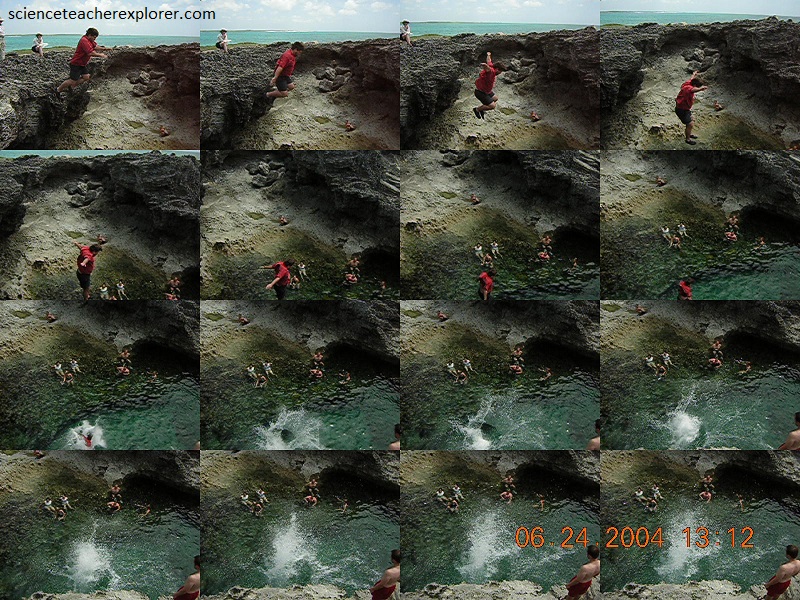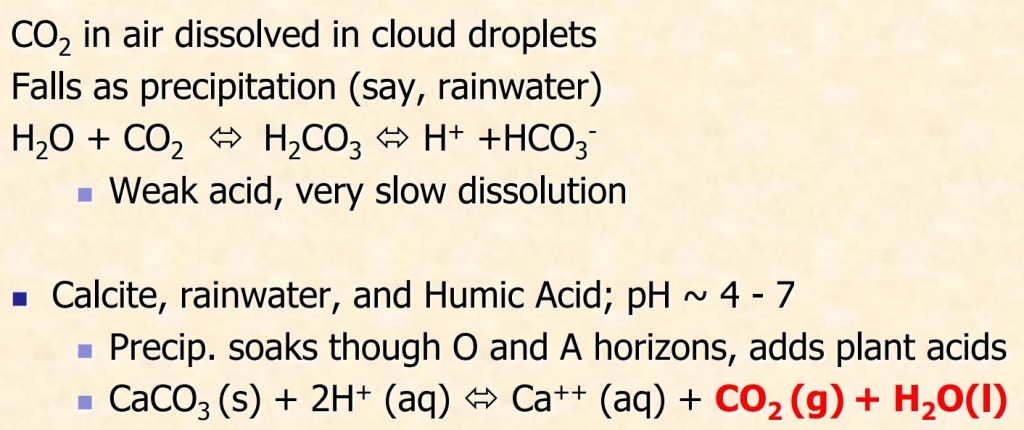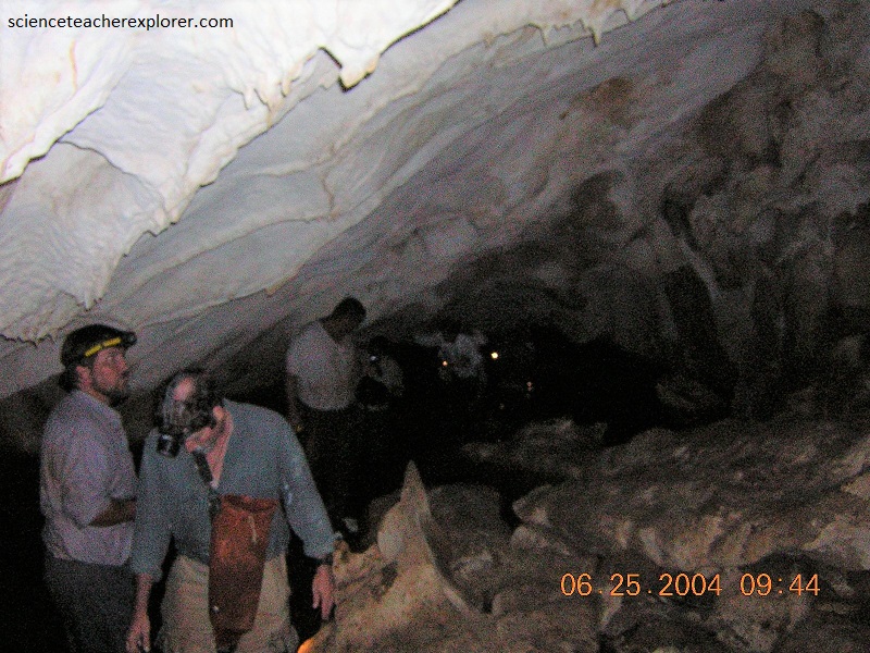 “Karst” is the general term used for cavernous areas. Most karst regions are found on carbonate rocks. The basic geomorphic process is a chemical solution. The acids produced by these chemical reaction processes are responsible for much of the dissolution in karst regions. Note, however, that temperature and the concentration of carbon dioxide in the atmosphere (including cave and soil atmospheres) control these chemical reactions. This means that it is possible to produce saturated solutions with many different calcium and carbon dioxide concentrations. When two of these solutions mix, they produce an unsaturated solution which results in more rock dissolution in the zone of mixing (imaged above). There are two distinct zones where waters with differing chemistry are mixing. The first of these is at the water table and the second is at the halocline (the fresh-salt water boundary). Because of this, dissolution tends to be concentrated here, resulting in cave formation.