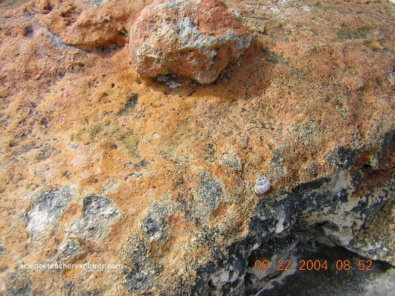 Pictured above is a hard, reddish-brown to orangish-brown colored, irregularly-sculpted crusted rock. This is dominant paleosol, (caliches or terra-rosas), on San Salvador Island. The presence of a terra rossa paleosol indicates that the rock outcrop is Pleistocene in age. In coastal locations, wave action can strip off the resistant paleosol. Because paleosols represent the weathering and erosion front on top of the carbonate rock, the paleosol commonly drapes a surface with relief of up to 1 m or more.