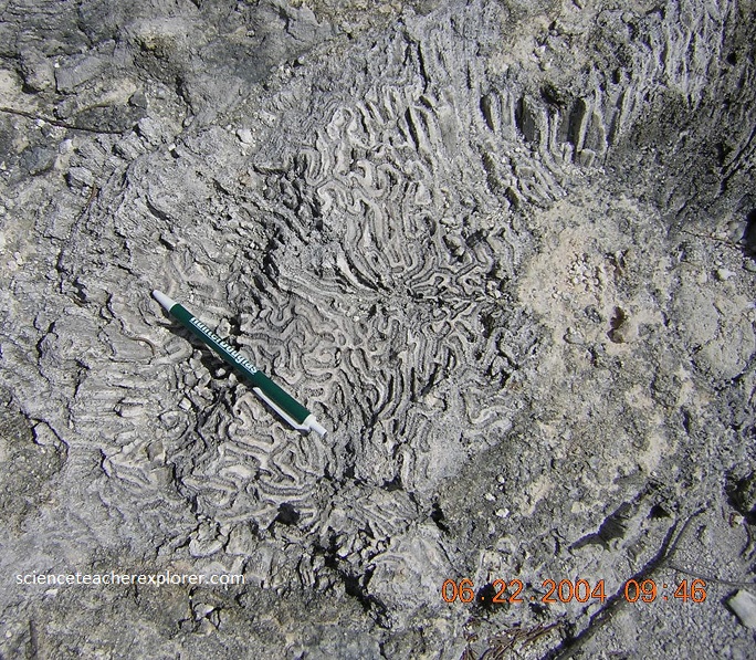 Pictured above, is a fossilized Diploria strigosa or fossil brain coral in the Cockburn Town Fossil Reef that is approximately 125,000 years old.