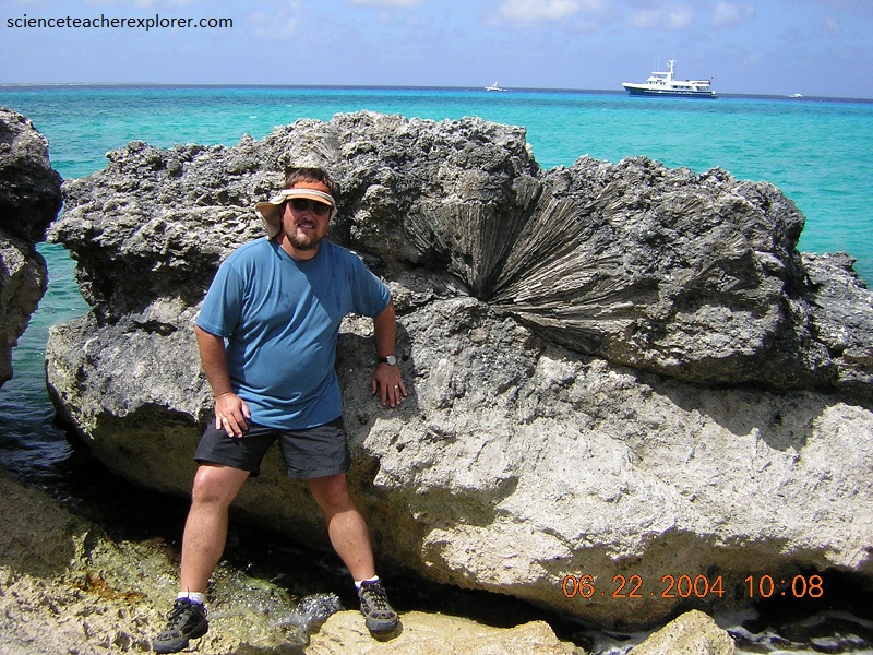 Pictured above, I’m standing next to a large fossilized brain coral colony called the “Diploria strigosa” in the Cockburn Town Fossil Reef. Notice that this fossil brain coral is crusting on an irregular surface that seems to be an unconformity. This unconformity seems traceable throughout the outcrop of the Cockburn Town Member and represents a limestone hardground surface that formed during a short-lived regression that occurred approximately 124,000 years ago. This is actually called the “Devil’s Point Event”. After the event, (at 123,000 years ago), the high sea level returned.
