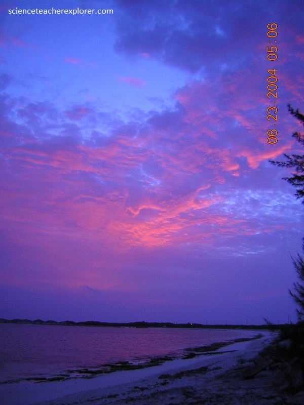 The next day, our scientific group decided to explore the north end of San Salvador Island. Pictured above, is just outside of the Gerace Research Centre looking toward the “Singer Bar Point”. Notice the pink aragonite sand, with the Beach Rock, along the western shoreline of south-eastern Graham’s Harbor. The pink coloration is the result of whitish aragonite sand sediments being mixed with reddish-colored fragments of the rotaliine foraminiferan, (Homotrema rubrum). Homotrema rubrum encrusts shells, dead coral, limestone clasts, or any other available hard substrate.