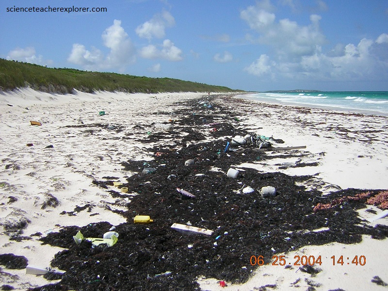 Pictured above, “strand lines” on an aragonite sand beach of “East Beach”, (northeastern San Salvador Island). These paricular strand lines are dominated by dead and desiccated “seaweed”, consisting of Sargassum (brown algae), Thalassia (turtle grass) and Syingodium (manatee grass). The brownish-colored clumps in the strand line on the right, near the water, were left “high and dry” by the most recent high tide. The blackish-colored strand lines on the left, higher up on the beach, were left by the last “Spring” tide. There seems to be an incredible range of types of anthropogenic materials and objects present (hard plastic objects are dominant).