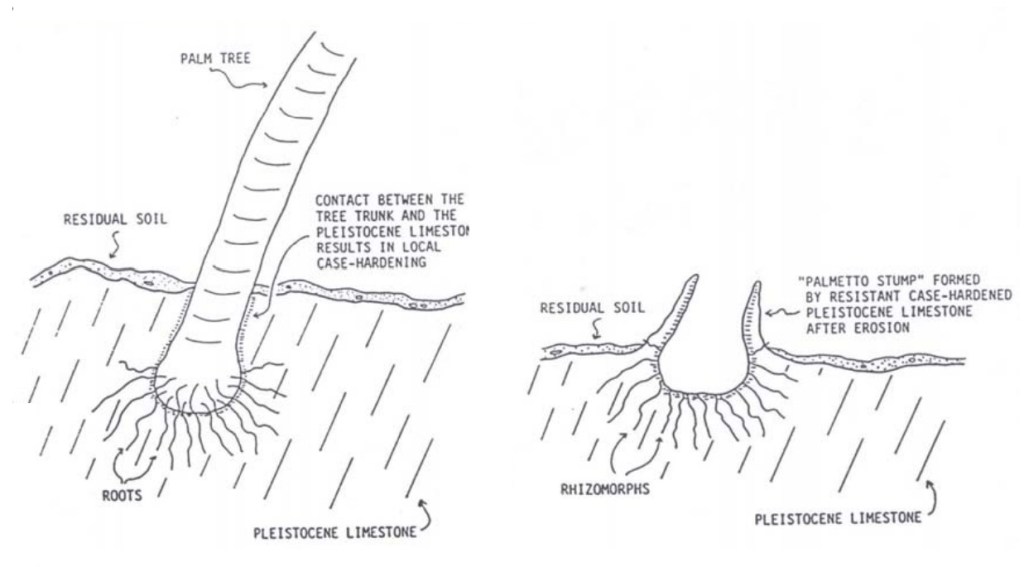 Pictured & imaged above, calcium carbonate cementation around this solution tube penetrated far into the surrounding limestone bedrock, which is rich in vegemorphs. Differential weathering and erosion resulted in a large, barrel-shaped structure called the “Palmetto Structure”.
