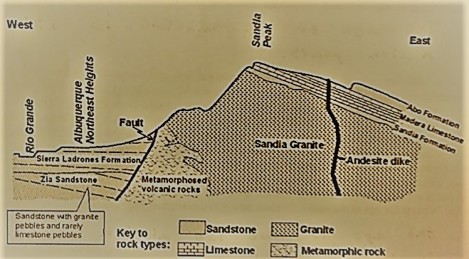 The Sandia granite is topped by a relatively thin layer (approximately 300 feet/100 meters) of sedimentary rock (mostly limestone, and some sandstone) of Pennsylvanian age (circa 300 million years ago). Numerous fossils of organisms that lived in the shallow sea can be found in the limestone units. Even younger sedimentary rocks, the colorful red and orange Abo and Yeso Formations, are found along the winding Sandia Crest National Scenic byway that climbs 21 km to Sandia Crest, (pictured below).
