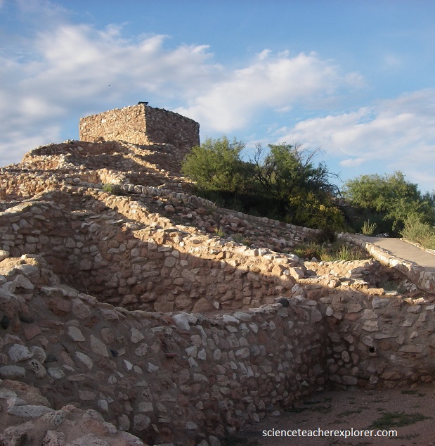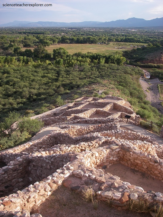 Pictured above, Tuzigoot National Monument preserves a 2- to 3-story pueblo ruin on the summit of a limestone and sandstone ridge just east of Clarkdale, Arizona, 120 feet (36 m) above the Verde River floodplain.