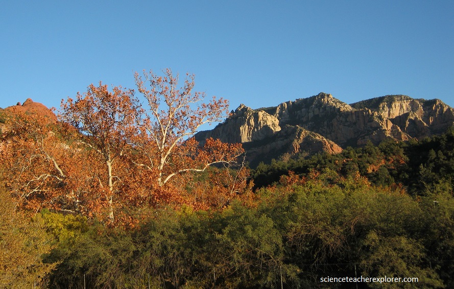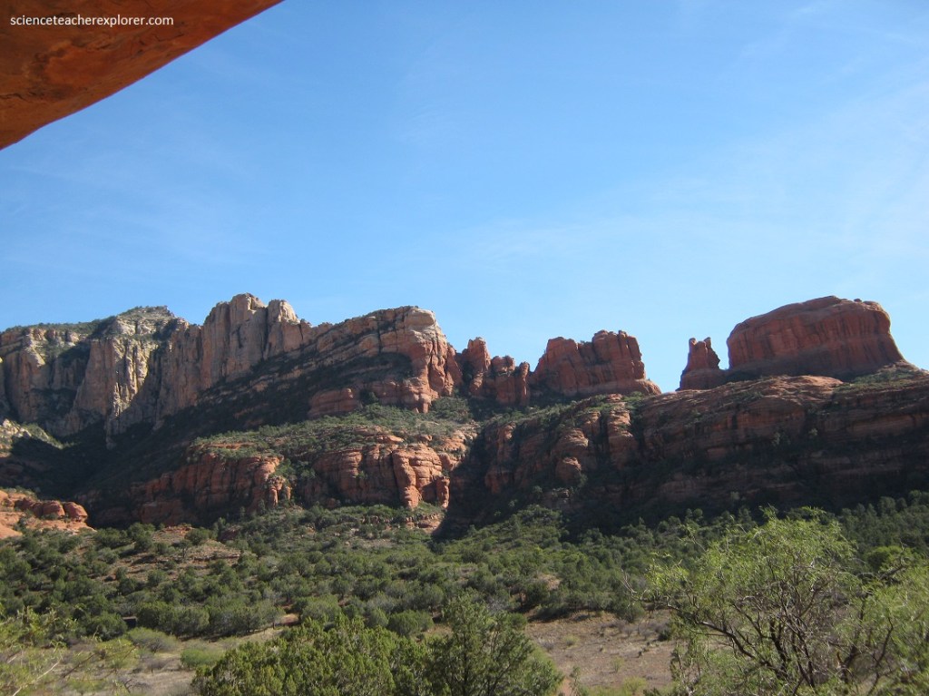 Towering cliffs of rich red Schnebly Hill Formation, a mixed sequelnce of sandstone, siltstone, and limestone, surround Sedona. The Schnebly Hill Formation was deposited during a single rise and fall in sea level during Permian time about 275 million years ago. As sea level rose, a finger of ocean called the Pedregosa Sea invaded the area from the southeast, never reaching much farther than Sedona before retreating back to the southeast. Much of Permian Arizona was a desert environment. Rivers, flowing from mountains in what is now Colorado, carried and deposited silt, sand, and gravel onto floodplains and alluvial fans, now the Hermit Shale. Sedona is built on this soft and easily eroded rock, and it forms the round slopes below the colorful red cliffs. The Schnebly Hill Formation was deposited as the invading ocean replaced the floodplains with sandy beaches, silty lagoons, and salty tidal flats. A thorough but brief deepening of the sea laid down a thin hard layer of limestone, (the Fort Apache Member), on top of the Bell Rock. Once the ocean had thoroughly retreated from the region, extensive wind-blown sand dunes covered everything with the Coconino Sandstone. This light-colored formation crowns the higher bluffs north of Sedona.