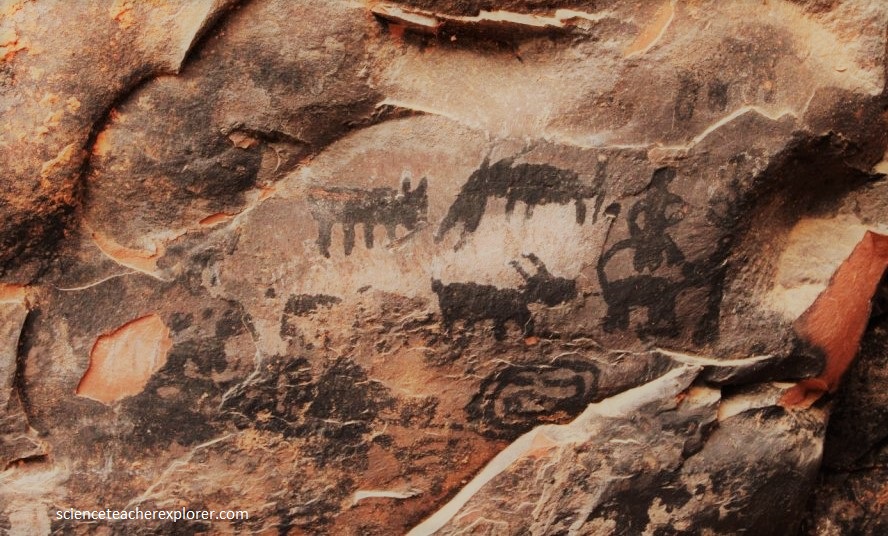 mond shapes, patterns of dots, concentric circles or spirals, helixes, and snakes as well as human and animal figures. In addition, a few tall, ghostly humanoid figures similar to those found in southern Utah’s Barrier Canyon loom in red on the canyon walls. One Kokopelli figure, also known as the hump-backed flute player.