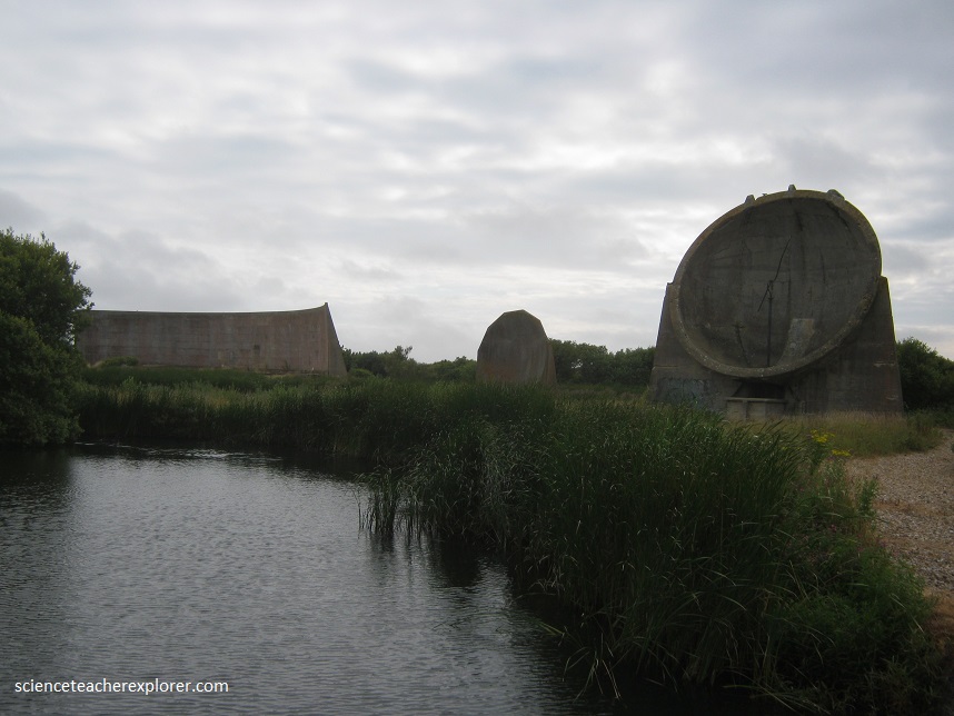 After the morning walk along the Seven Sisters, I continued exploring the area by visiting the Dungeness Mirrors, 60 km northwest away. The Dungeness Mirrors are three concrete structures that act as Sound-Mirrors or Listening Devices. They were built around 1930 for experiments to detect enemy aircraft. The concave shape of the mirror collected and amplified sound from aircraft engines and could also indicate from which direction the noise was coming. The structures were intended to provide air aid warnings and to assist interception of an attack. This system was never fully operational and was made obsolete by methods of detection based on radio waves that were introduced from the late 1930s. This system became radar.