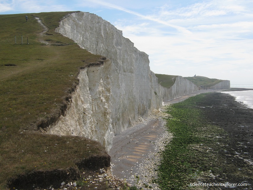 The calcareous parts of tiny marine algae and seashell fragments formed white chalk ridges under the sea some 130-60 million years ago.